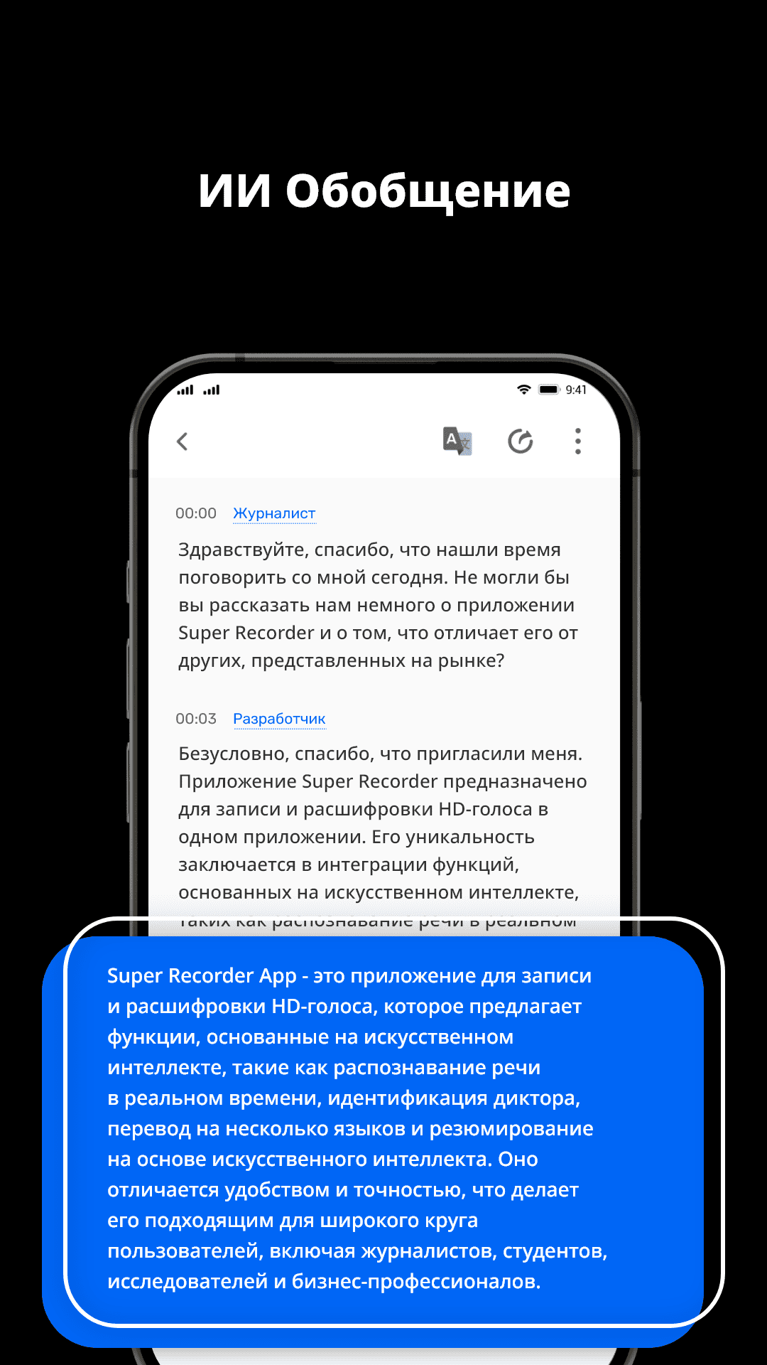 Super Voice Recorder – универсальное приложение для записи голоса и звука, разработанное для создания качественных аудиофайлов и удобного управления ими. Программа позволяет не только записывать голосовые заметки, но и преобразовывать их в текст, редактировать аудиофайлы и обеспечивать безопасность записей. С его помощью можно легко записывать встречи, лекции, интервью, идеи, а также использовать для личных заметок. Приложение обладает интуитивно понятным интерфейсом и широким набором функций, включая высококачественную запись, поддержку шумоподавления и транскрипцию в реальном времени.