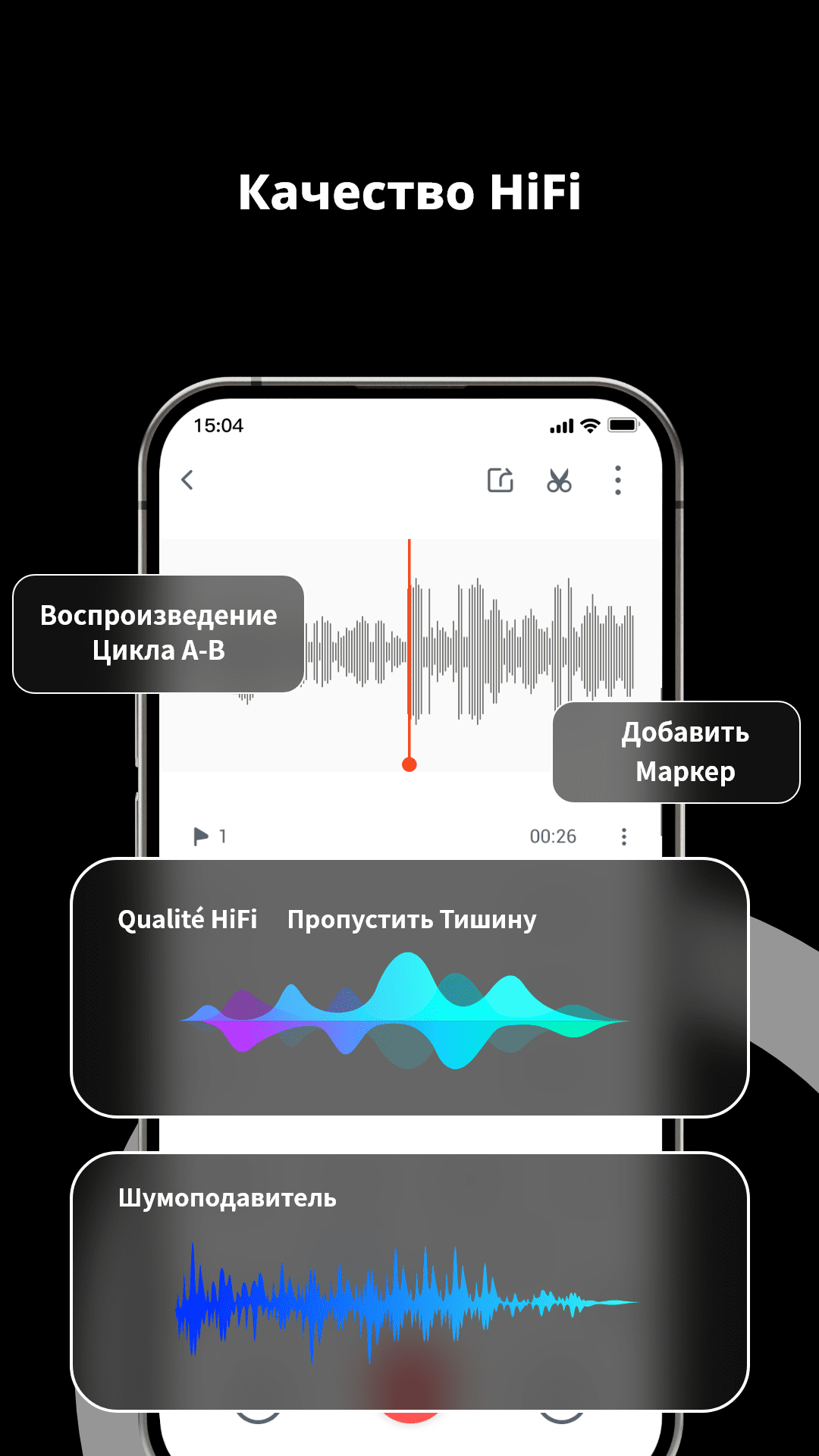 Приложение для записи и обработки аудио, поддерживающее Hi-Fi качество, транскрипцию в...