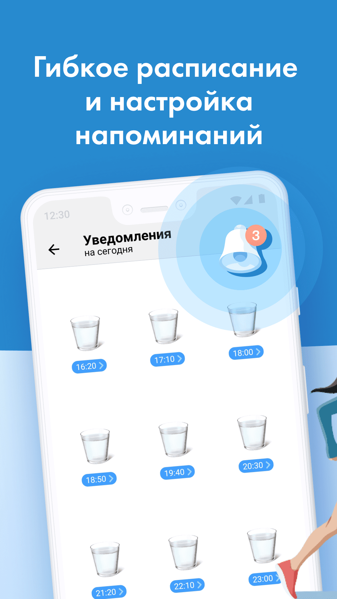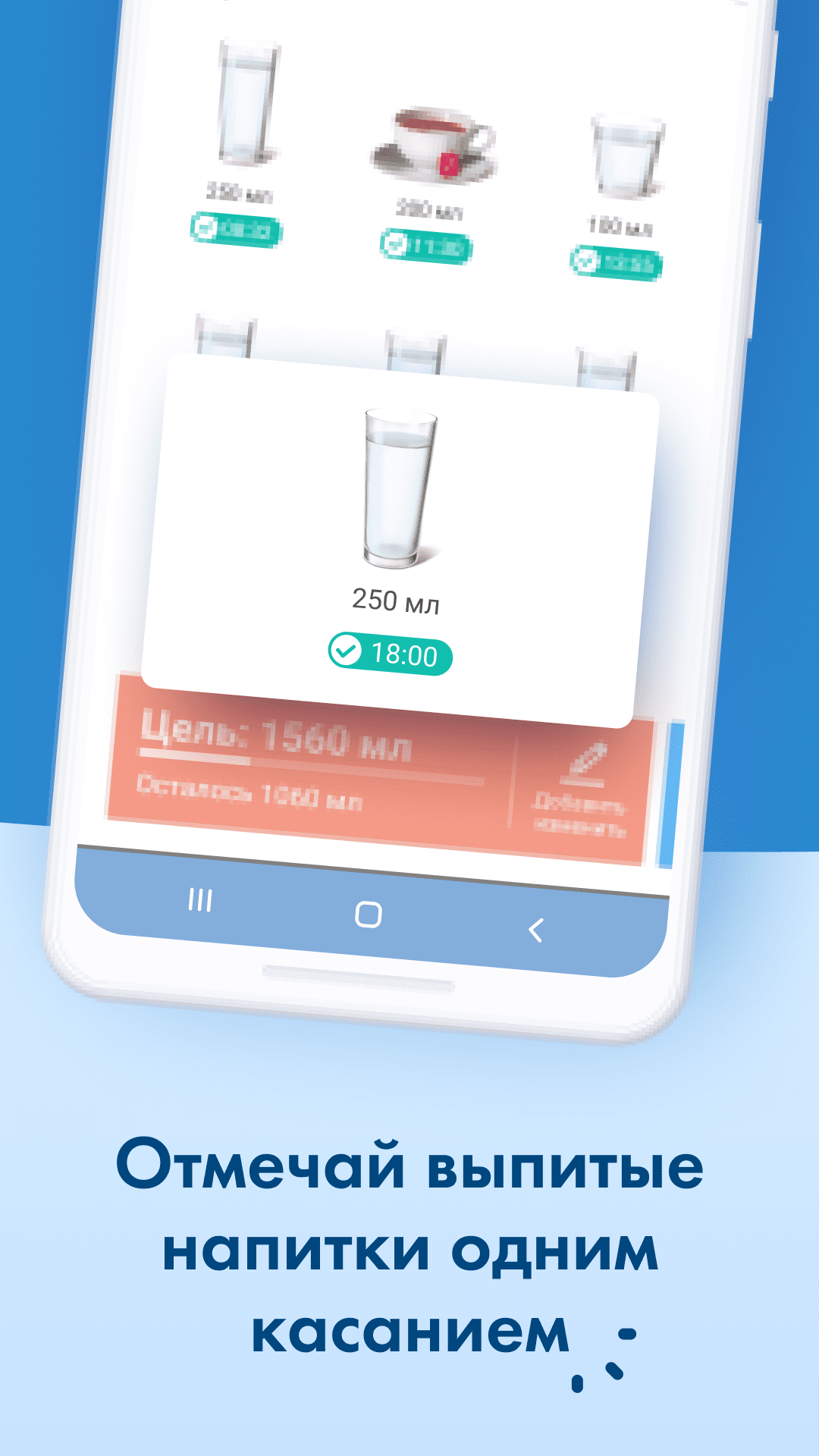 - Таймер напоминаний, помогающий не забывать о приеме воды в течение дня.