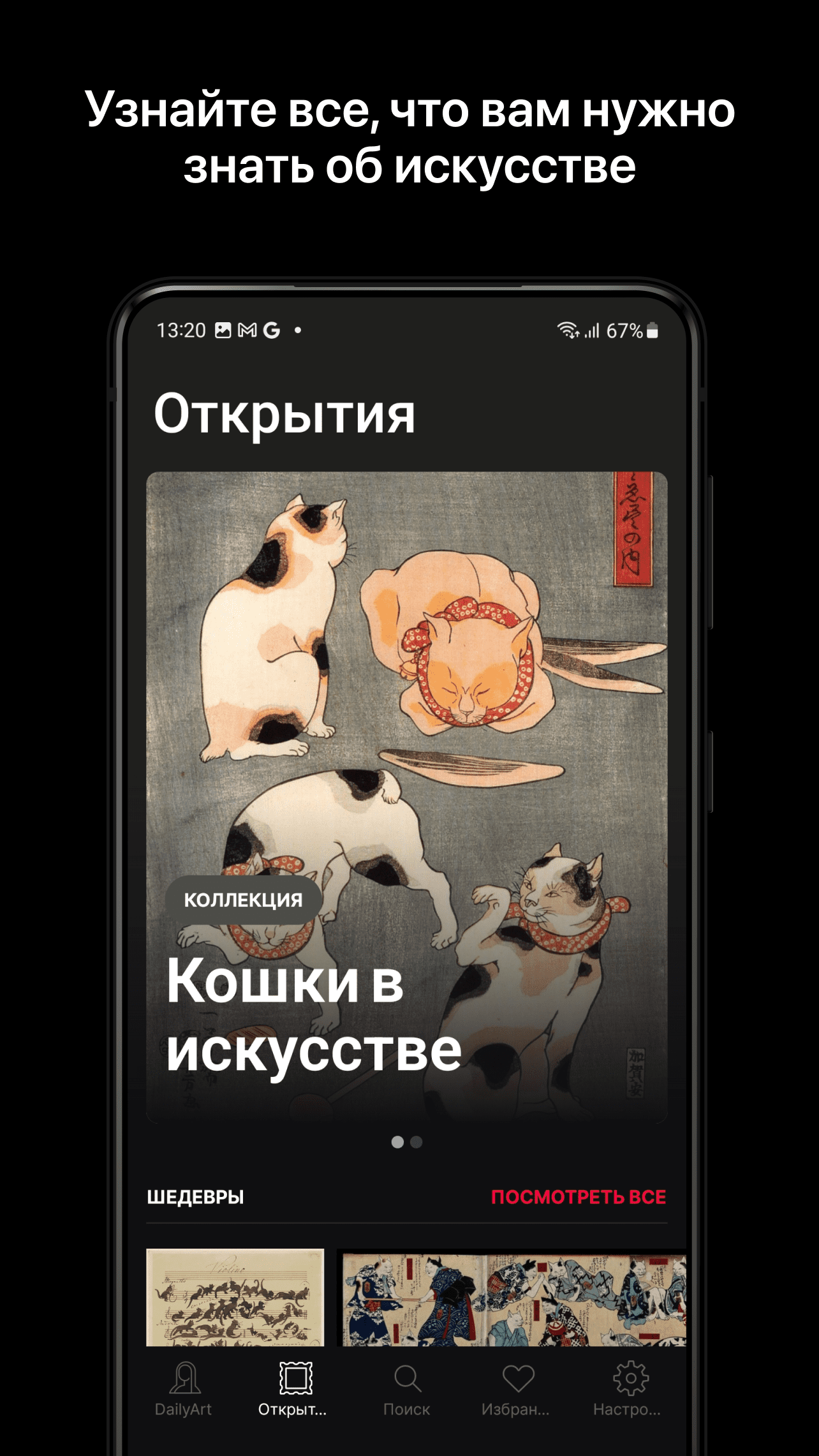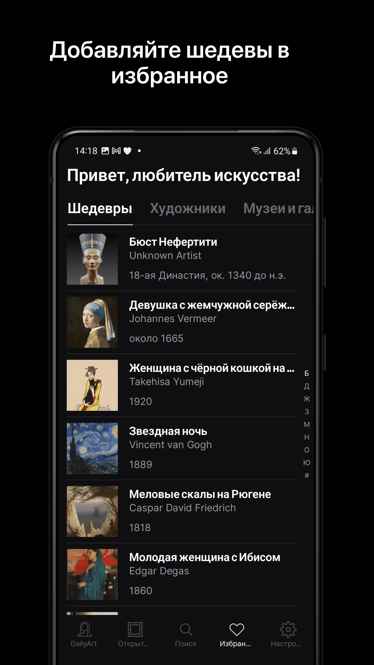- Получение ежедневных уведомлений с новыми произведениями искусства.