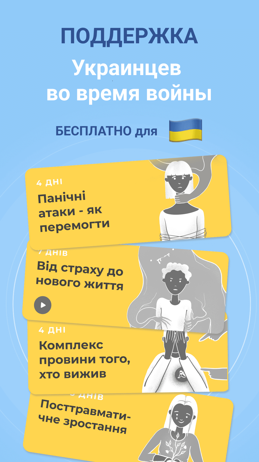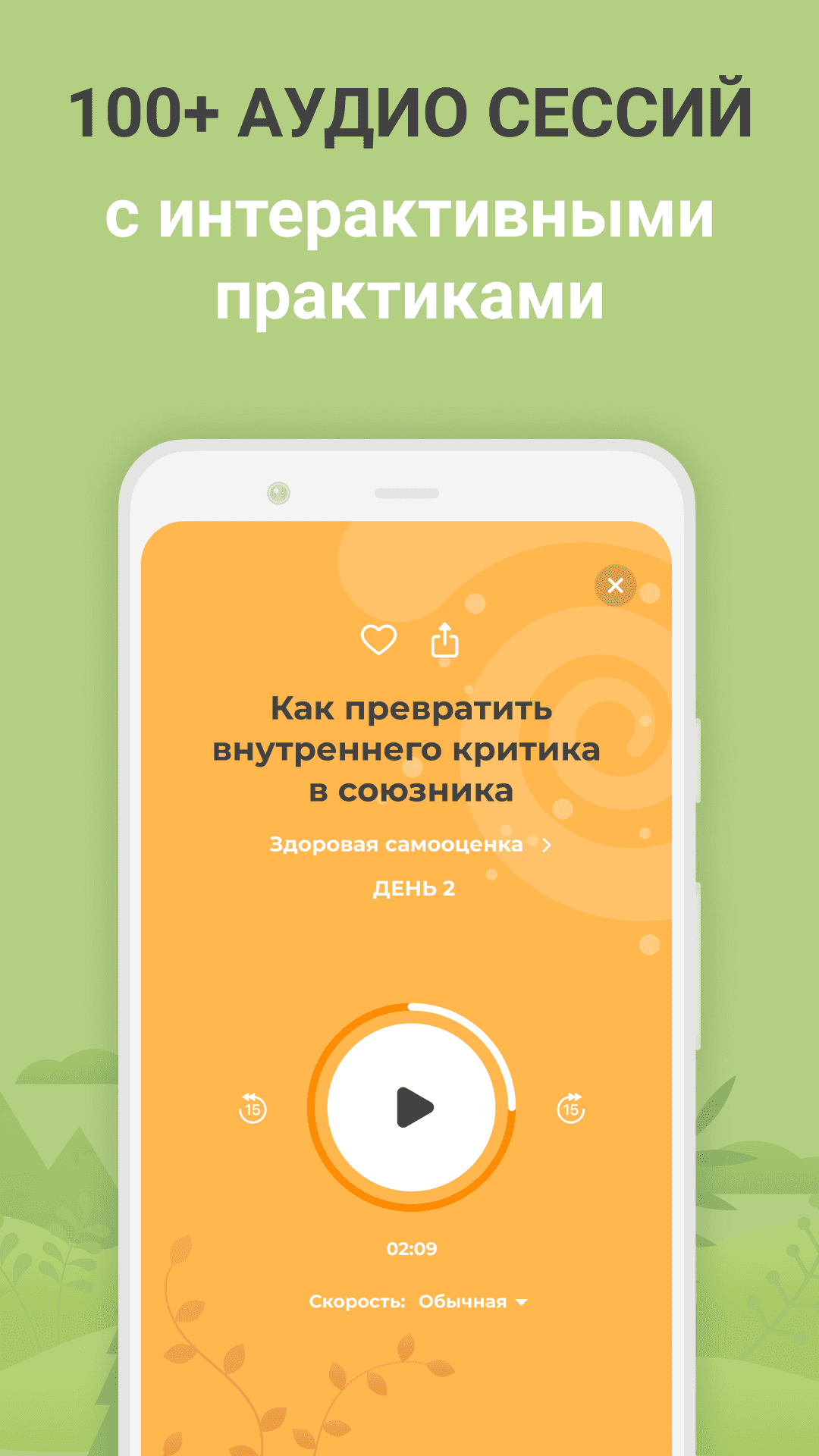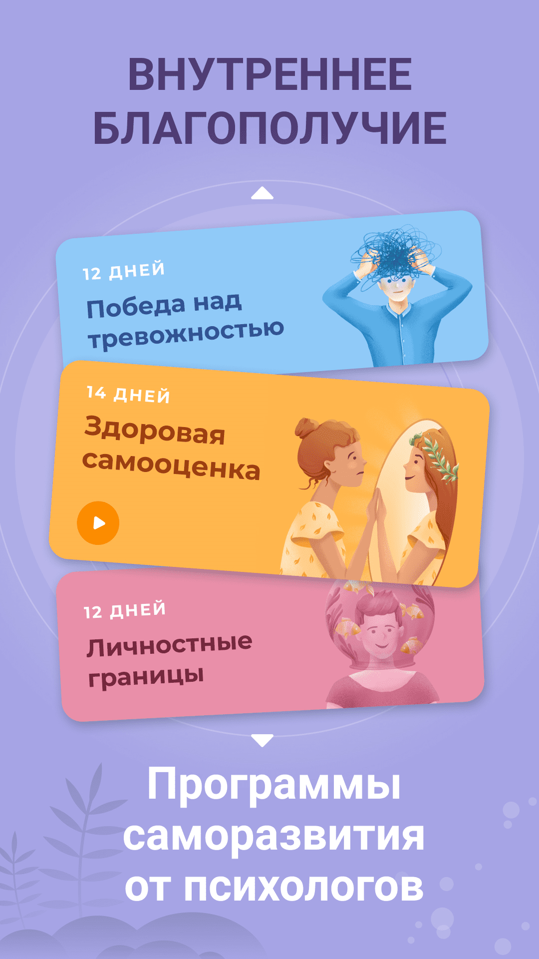 Также приложение содержит медитации и телесные практики для глубокого и комплексного терапевтического эффекта. Важной частью приложения является календарь привычек, который помогает закрепить новые полезные практики и напомнит о продолжении работы над собой.