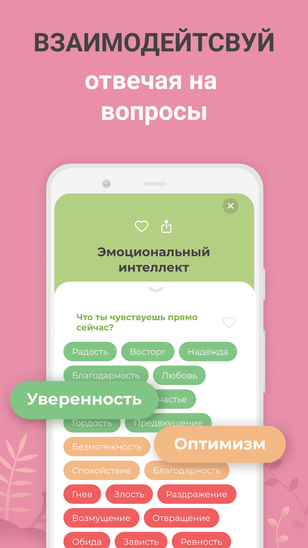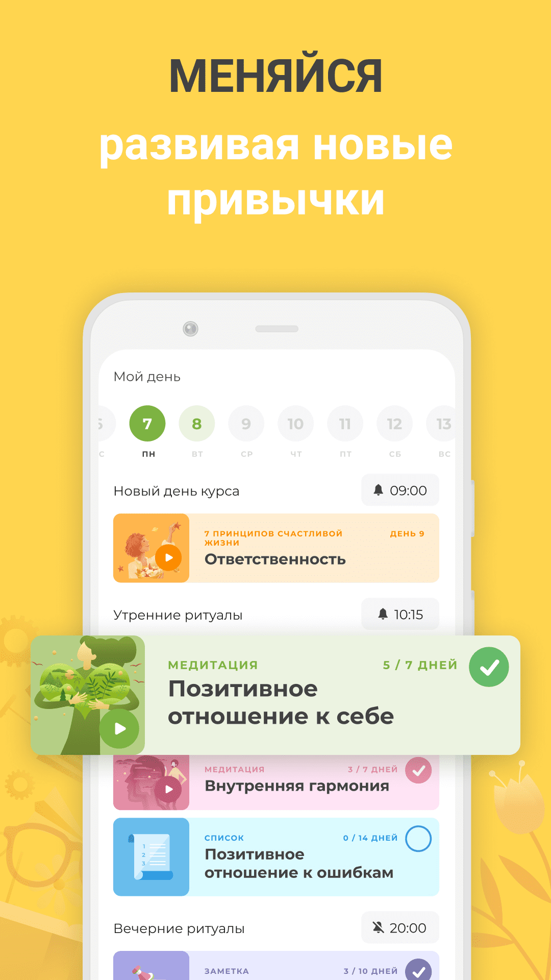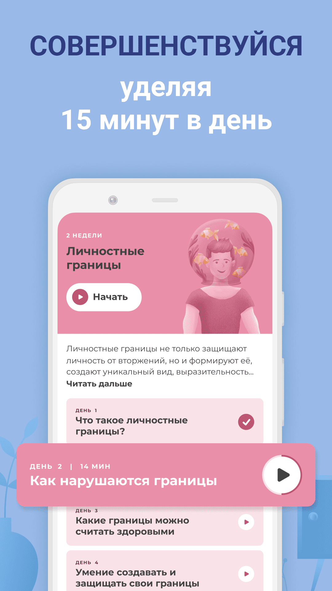 Также приложение содержит медитации и телесные практики для глубокого и комплексного терапевтического эффекта. Важной частью приложения является календарь привычек, который помогает закрепить новые полезные практики и напомнит о продолжении работы над собой.