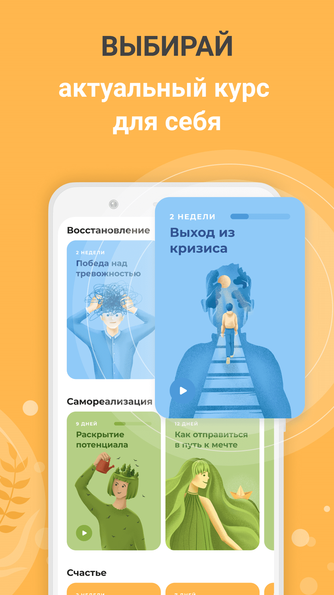 Mental Health Therapy — приложение для саморазвития, которое предлагает курсы, ориентированные на психологическую помощь, медитации и практики для улучшения качества жизни. Основой контента является когнитивно-поведенческая терапия (CBT), подход, направленный на изменения негативных мыслей и поведения. Курсы разработаны для решения жизненных задач, таких как снижение стресса, улучшение самооценки и мотивации, преодоление тревоги и другие аспекты личностного роста.