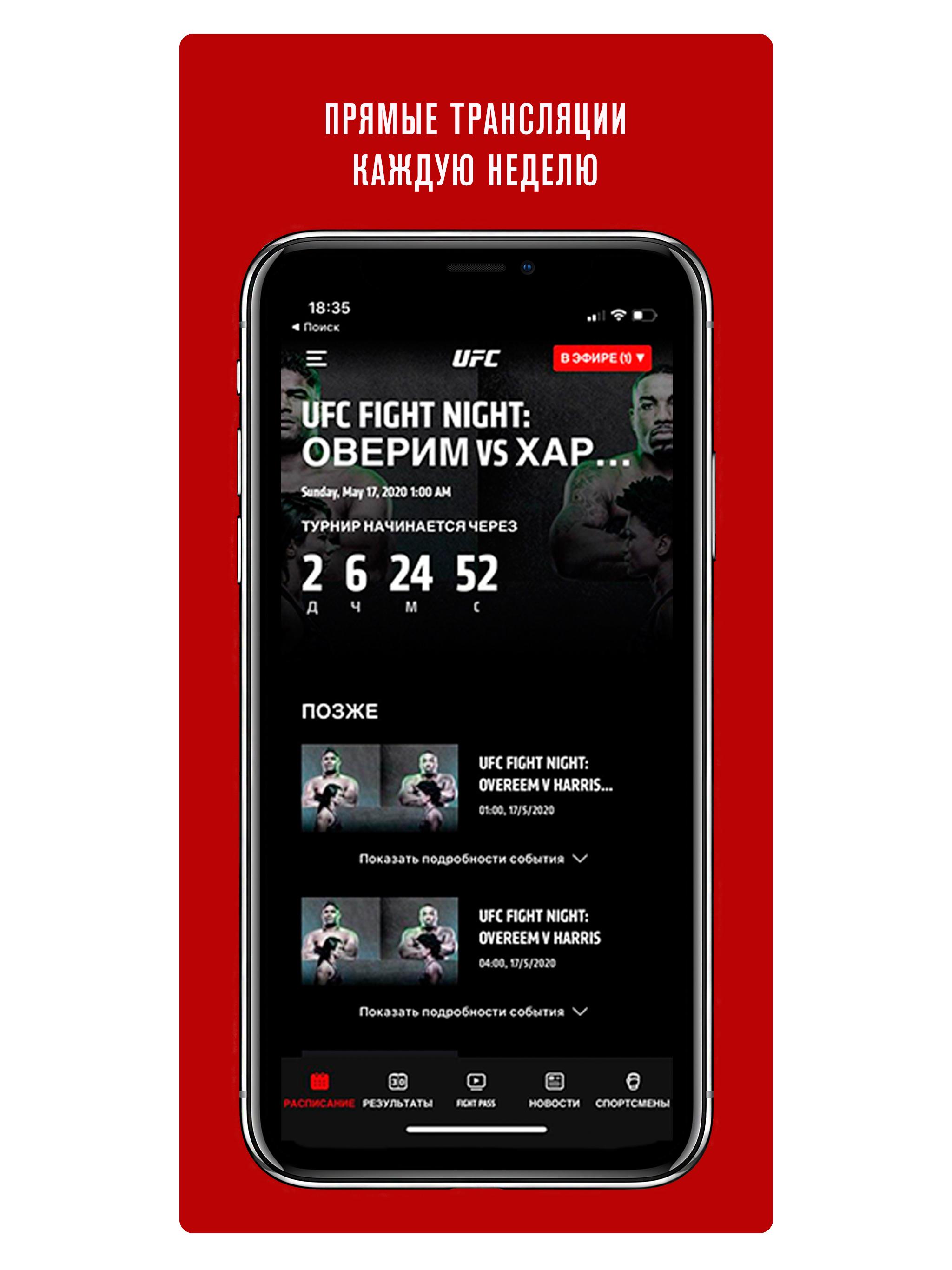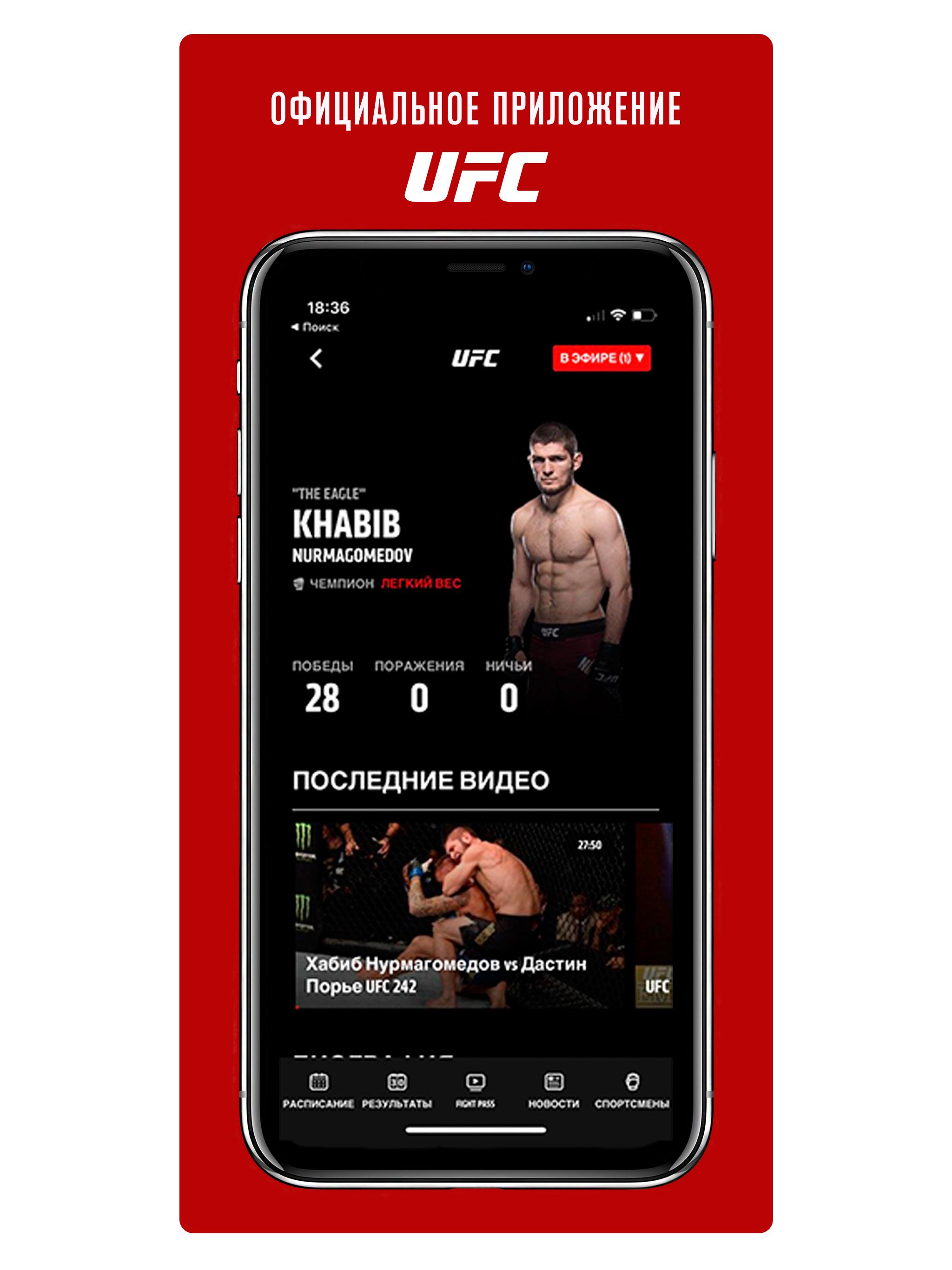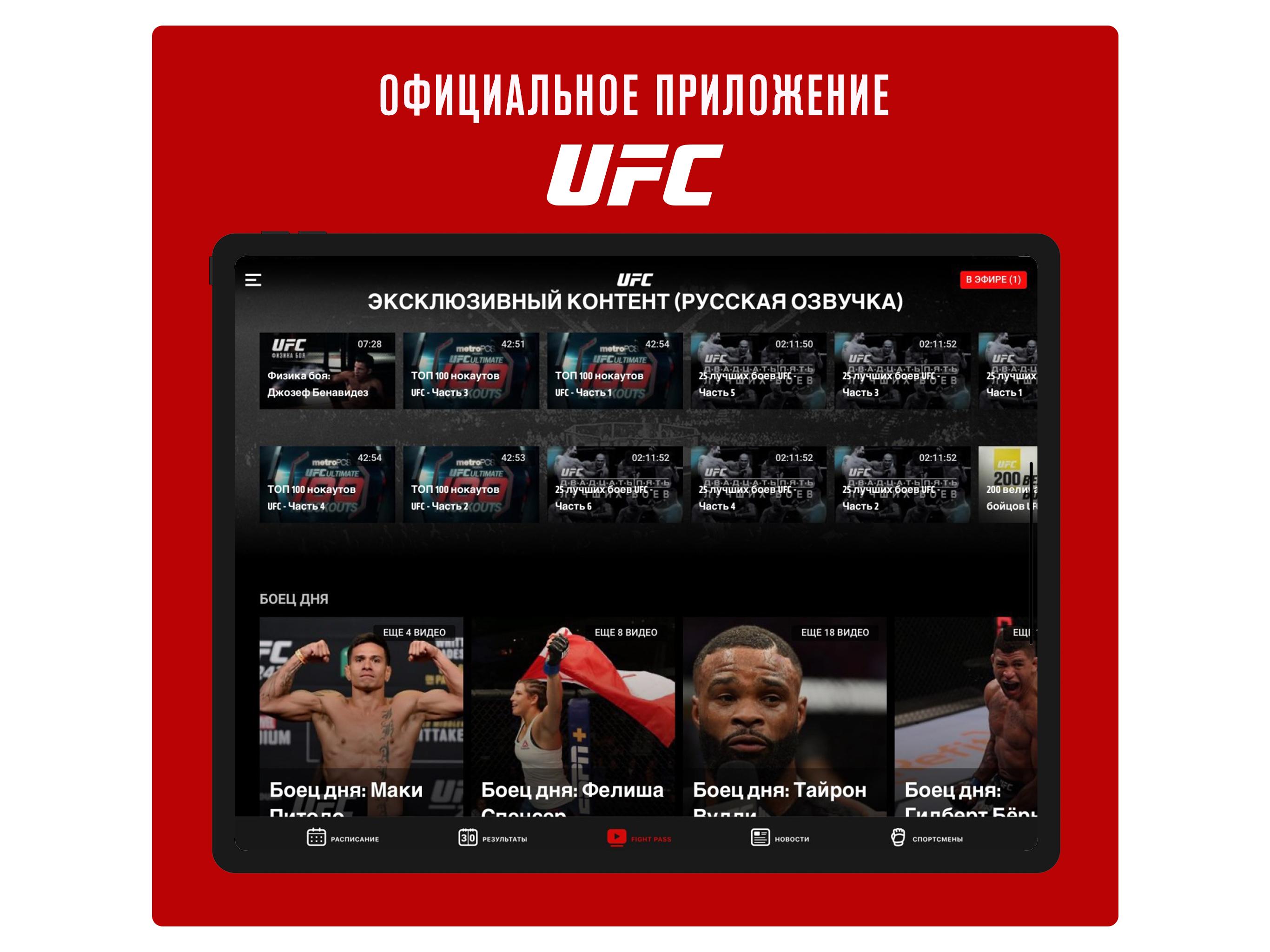 - Прямые трансляции турниров UFC на русском и английском языках.