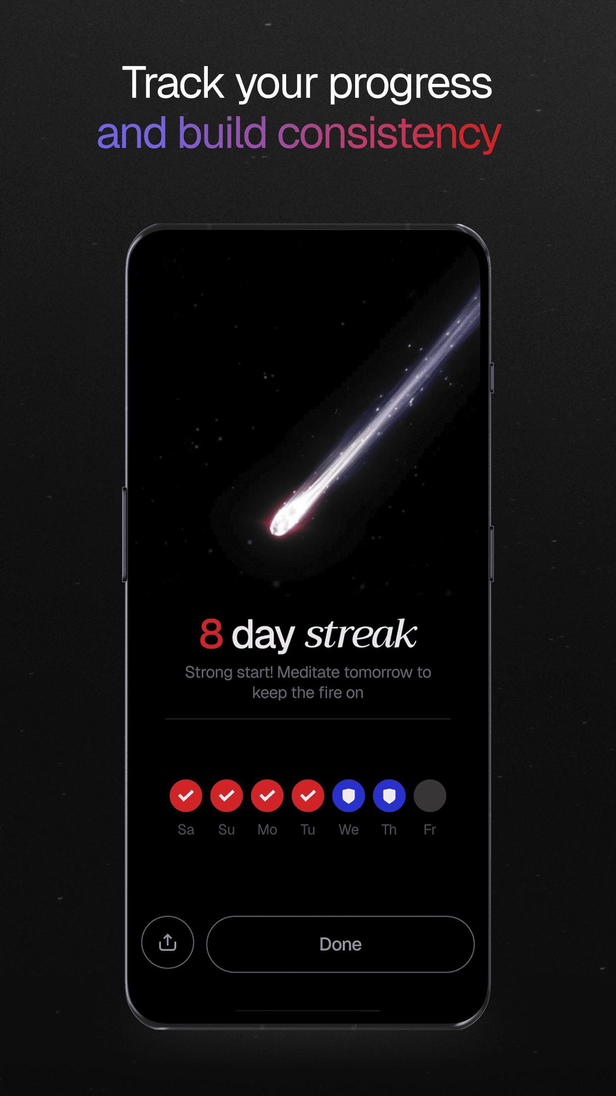 В приложении есть инструменты для улучшения медитативной практики, такие как гибкие интервалы, увеление длительностью сессий, спокойную фоновую музыку и звук колокольчика, что лучше погрузиться в медитацию. Также можно отслеживать достижения, получать награды и анализировать подробную статистику.