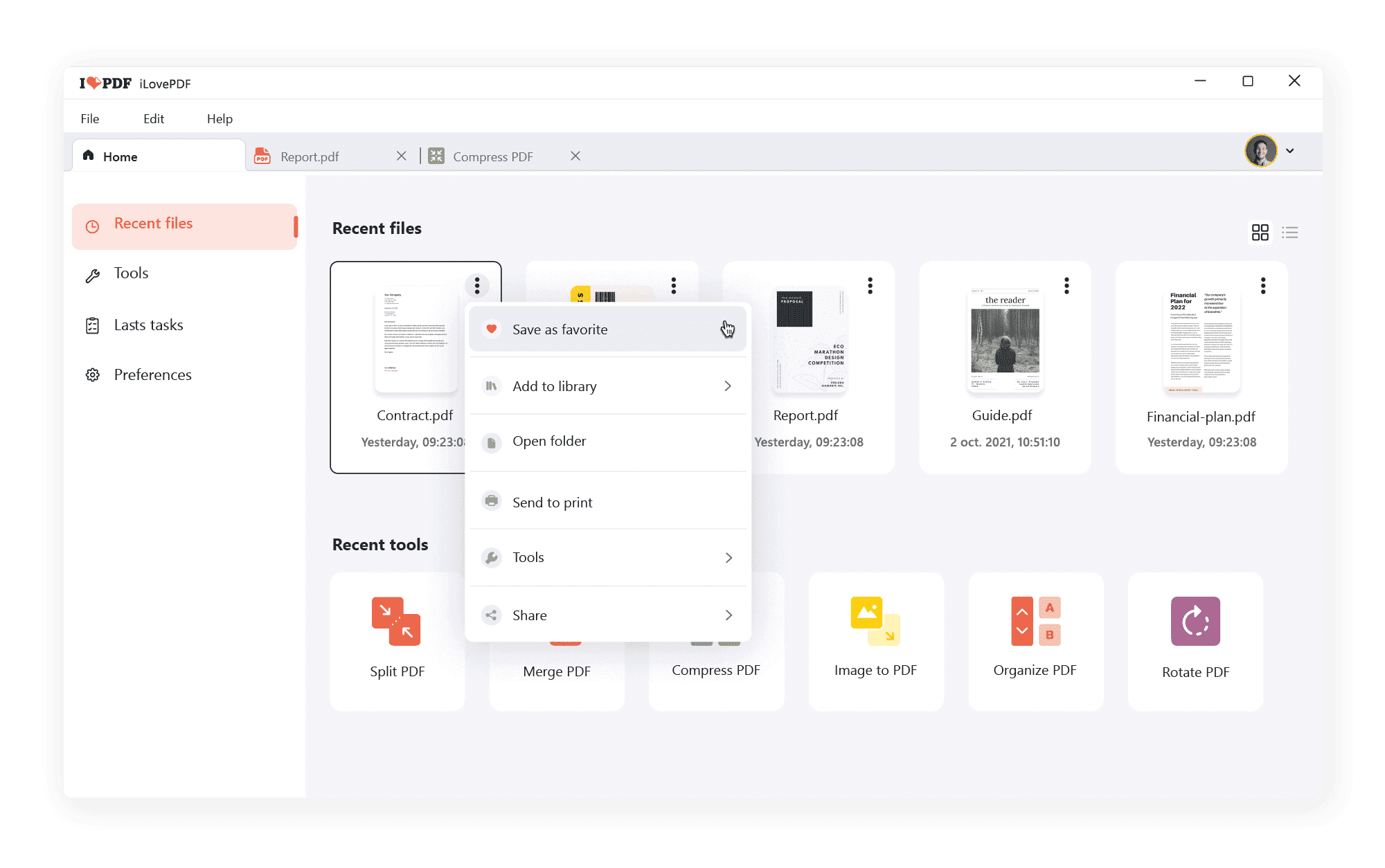 iLovePDF — приложение для комплексной работы с PDF-документами, совмещает в себе функции PDF-ридера, редактора и конвертера. Многовкладочный интерфейс дает возможность одновременно работать с несколькими PDF-файлами, обеспечивает удобную навигацию и быстрый доступ к функциям редактирования.