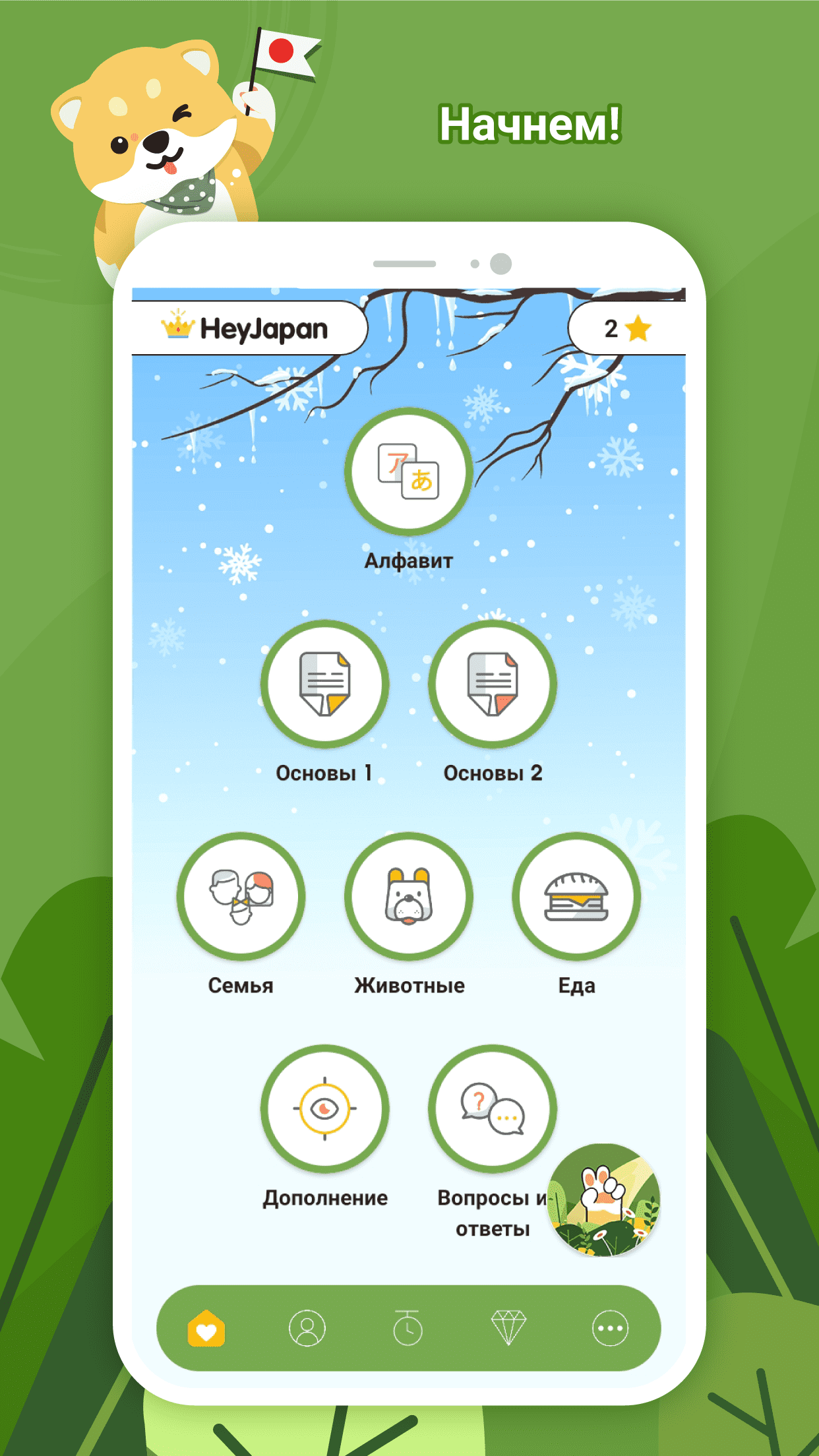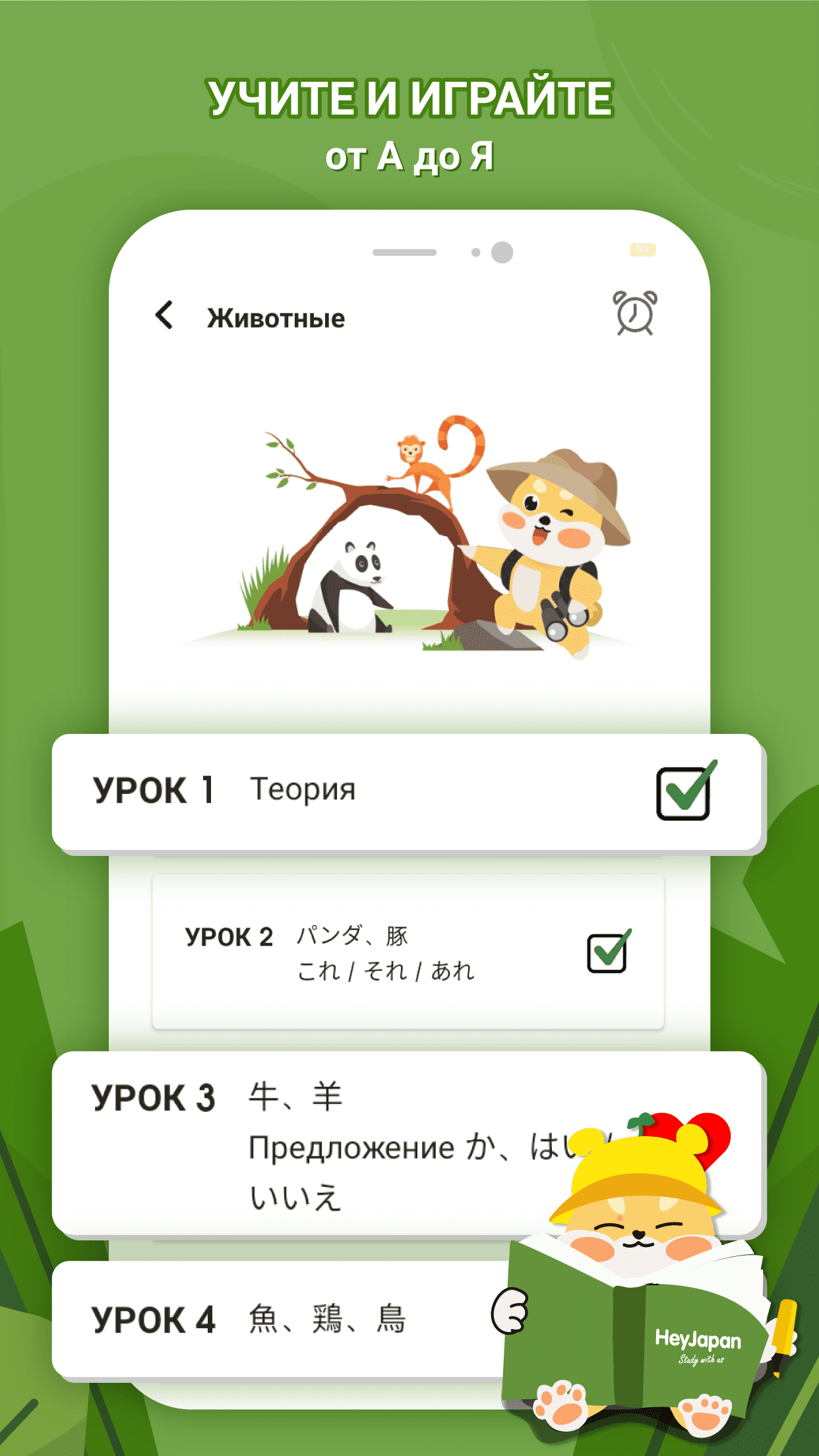 HeyJapan — приложение для самостоятельного изучения японского языка с нуля. Предлагает все основные аспекты обучения: изучение алфавитов, пополнение словарного запаса, грамматические конструкции, аудирование и тренировку устной речи. Программу можно использовать для подготовки к экзамену по японскому языку уровня JLPT N4.