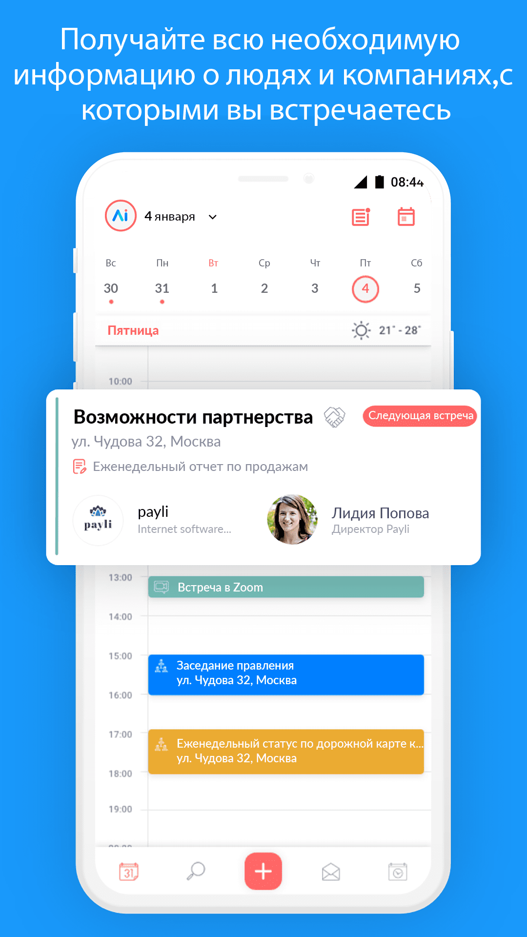 Программа помогает автоматизировать подготовку к встречам, предлагает подробную информацию о других участниках — их должности, компании и социальные профили. Дает возможность настраивать время доступности, отправлять приглашения, проводить голосования по выбору времени и вести совместную повестку. Среди дополнительных функций: выбор формата календаря, работа с заметками, прогноз погоды, отображение маршрута и оценка времени в пути.
