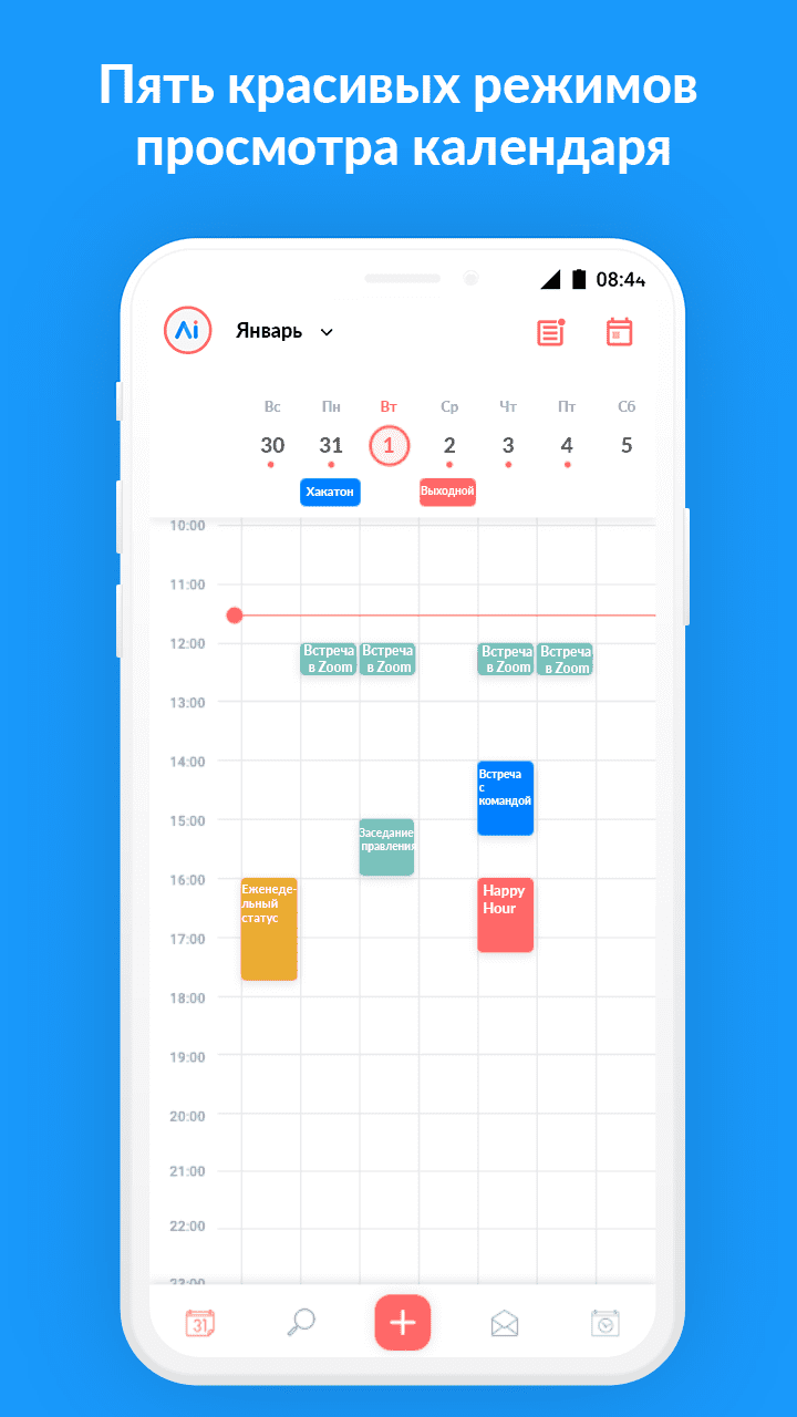 - Предлагает гибкие стили отображения календаря: день, 3 дня, неделя, месяц.