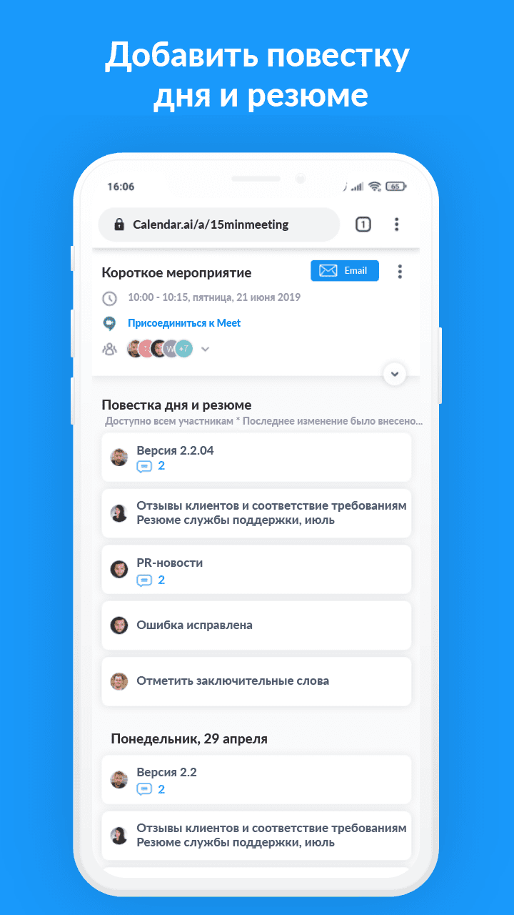 - Интегрируется с популярными сервисами для организации встреч, включая Calendly, Doodle, Acuity и др.