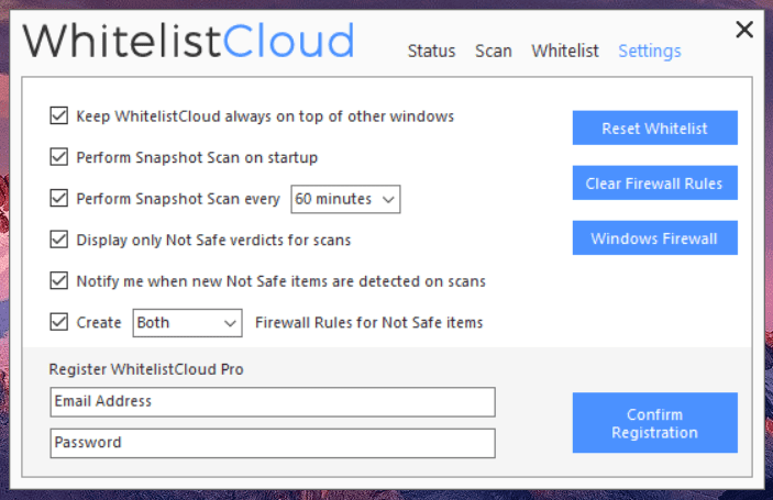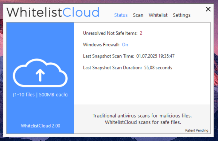 При первом запуске приложение создает начальный белый список на основе всех текущих процессов, работающих в системе, считая их безопасными. В дальнейшем при новом сканировании запущенных процессов, программа сравнивает их с обновлённым облачным белым списком. WhitelistCloud выявляет потенциально опасные компоненты, не зарегистрированные в списке доверенных объектов. Пользователь получает информацию о текущем состоянии системы, в том числе статистику сканирований, статус встроенного брандмауэра Windows и количество неподтвержденных элементов.