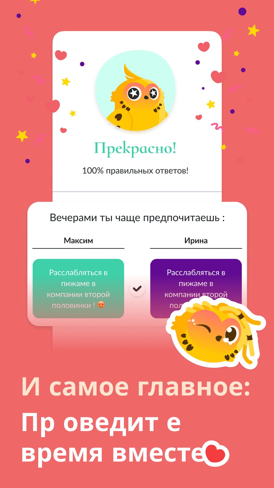 - Предлагает сценарий угадывания ответов партнёра на основе личных предпочтений.