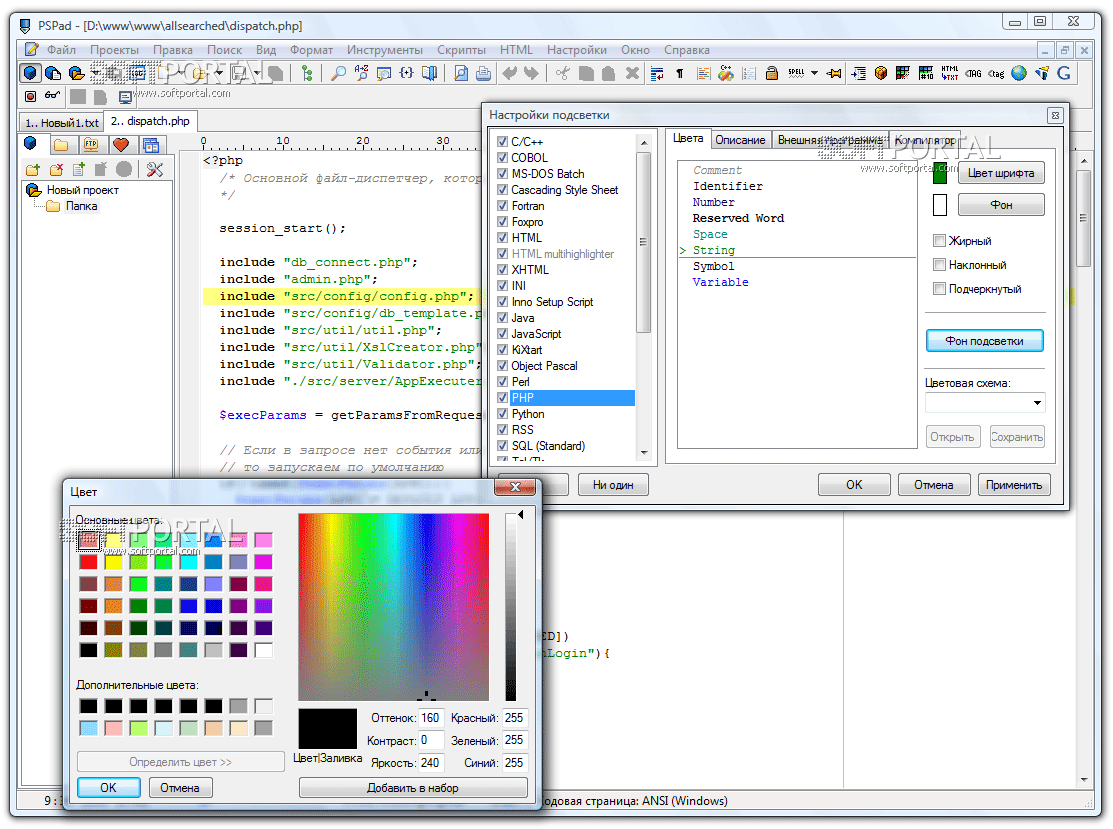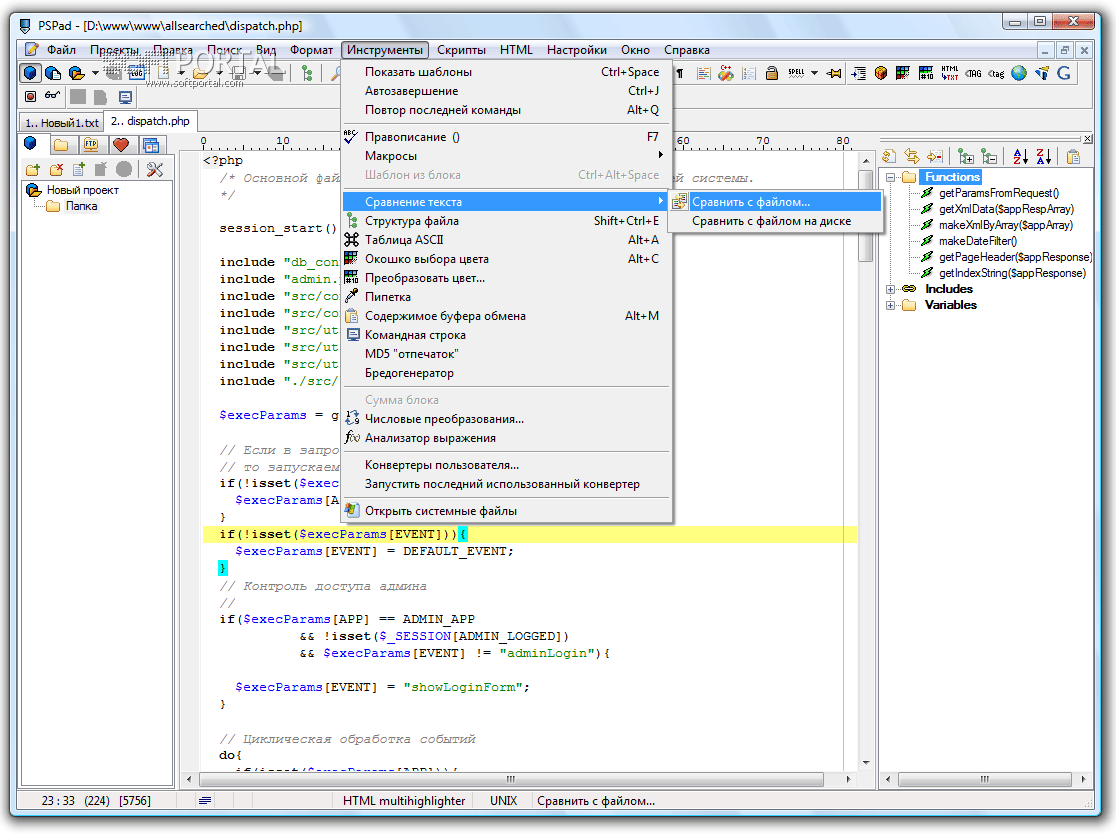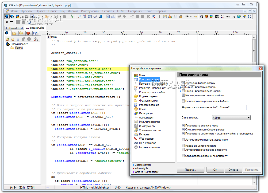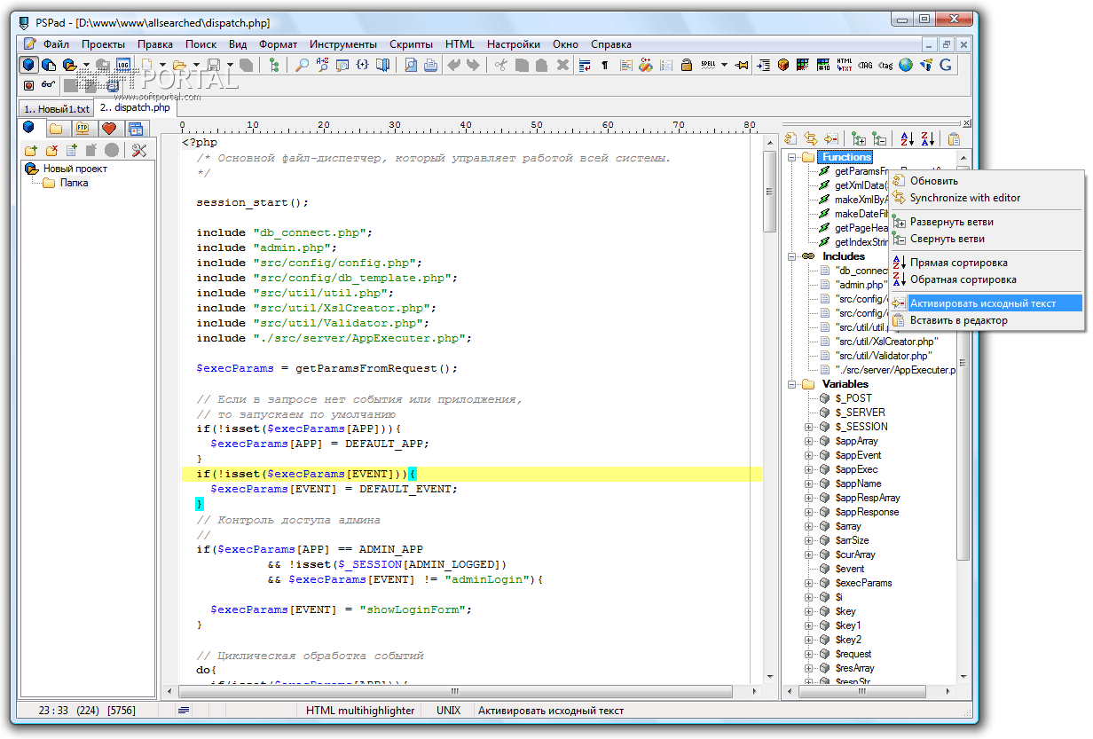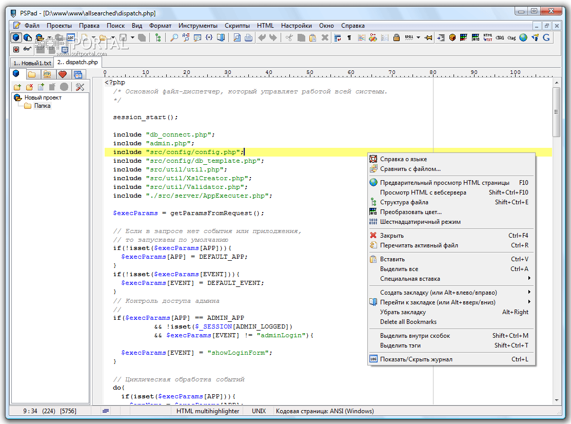 - Сохранение экранной сессии. При следующем входе PSPad автоматически откроет все открытые на момент закрытия файлы