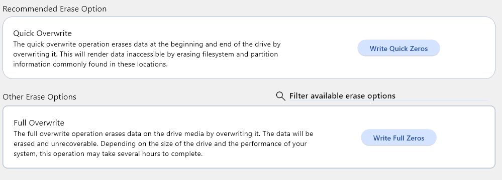 - Предлагает безопасное удаление данных перед утилизацией накопителя.