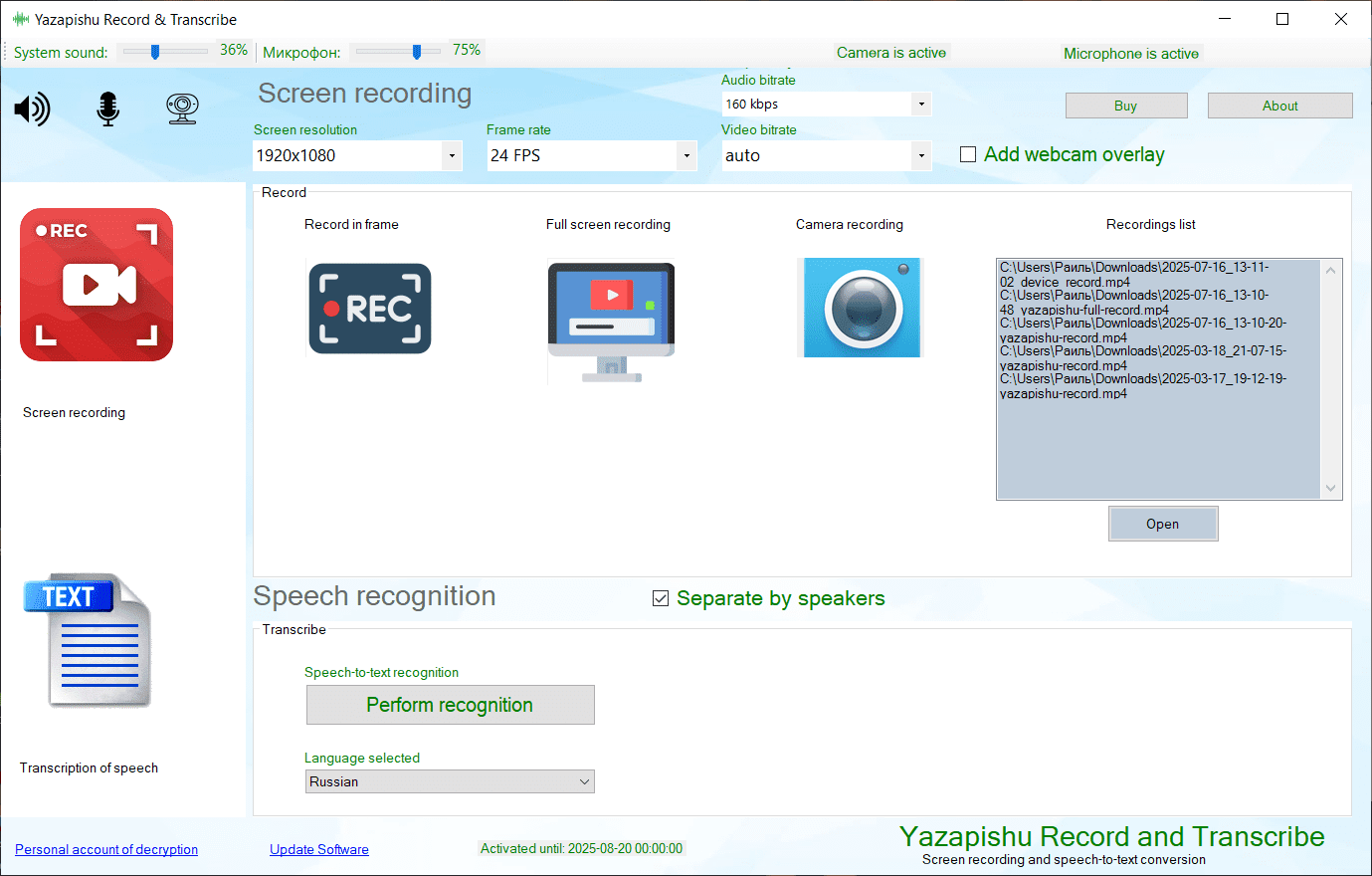 Программа предлагает пользователю гибкую настройку параметров записи, несколько вариантов захвата: пользователь может выбрать запись всей области экрана, определенного окна или видеопотока с камеры, а также встроенный механизм преобразования речи в текст. Поддержка ручного выбора языковых пар дает возможность контролировать процесс транскрипции. Интерфейс приложения предусматривает удобный доступ к настройкам вывода: разрешение, частота кадров и аудиобитрейт, что дает возможность адаптировать результаты записи под задачи.