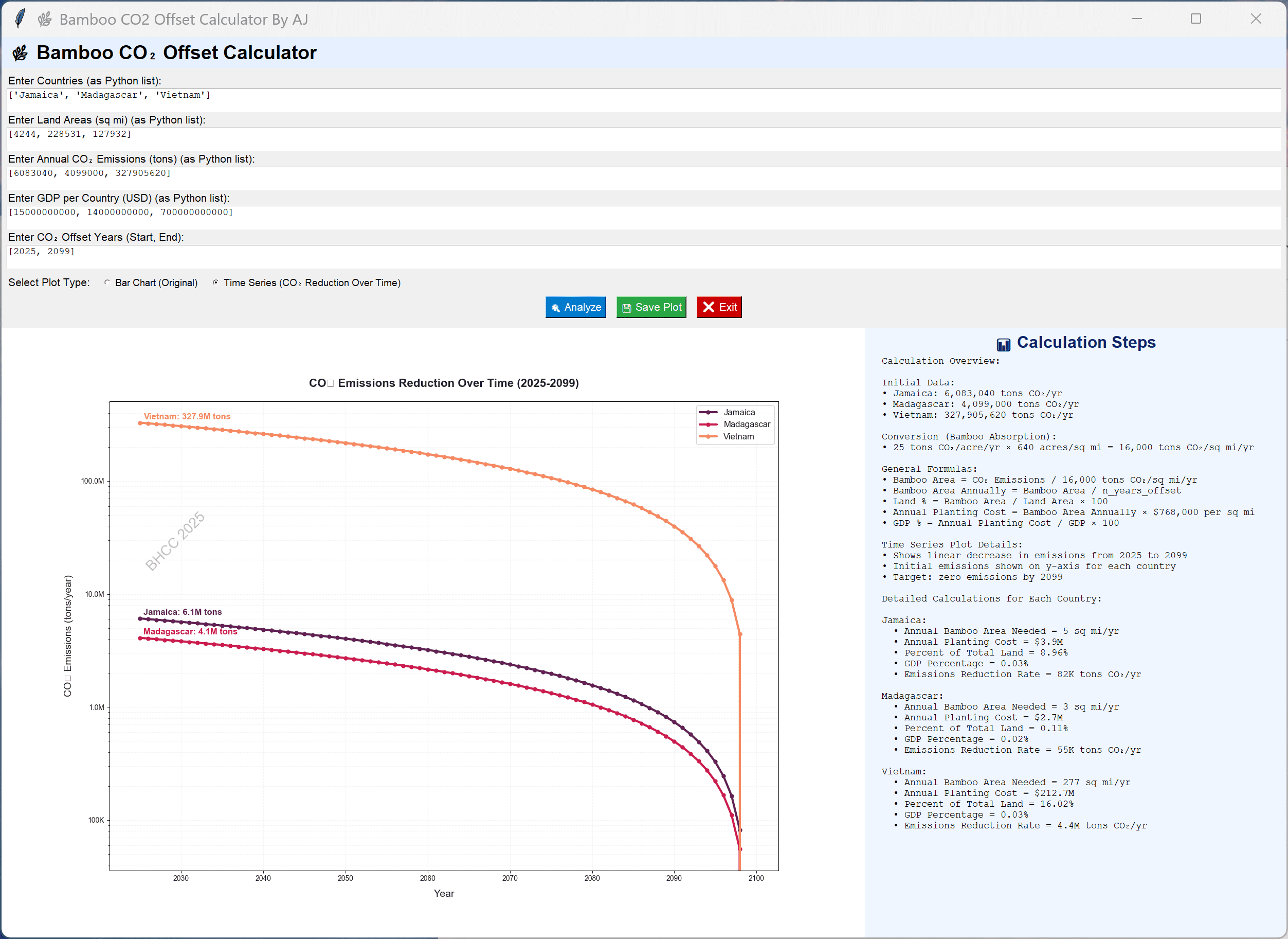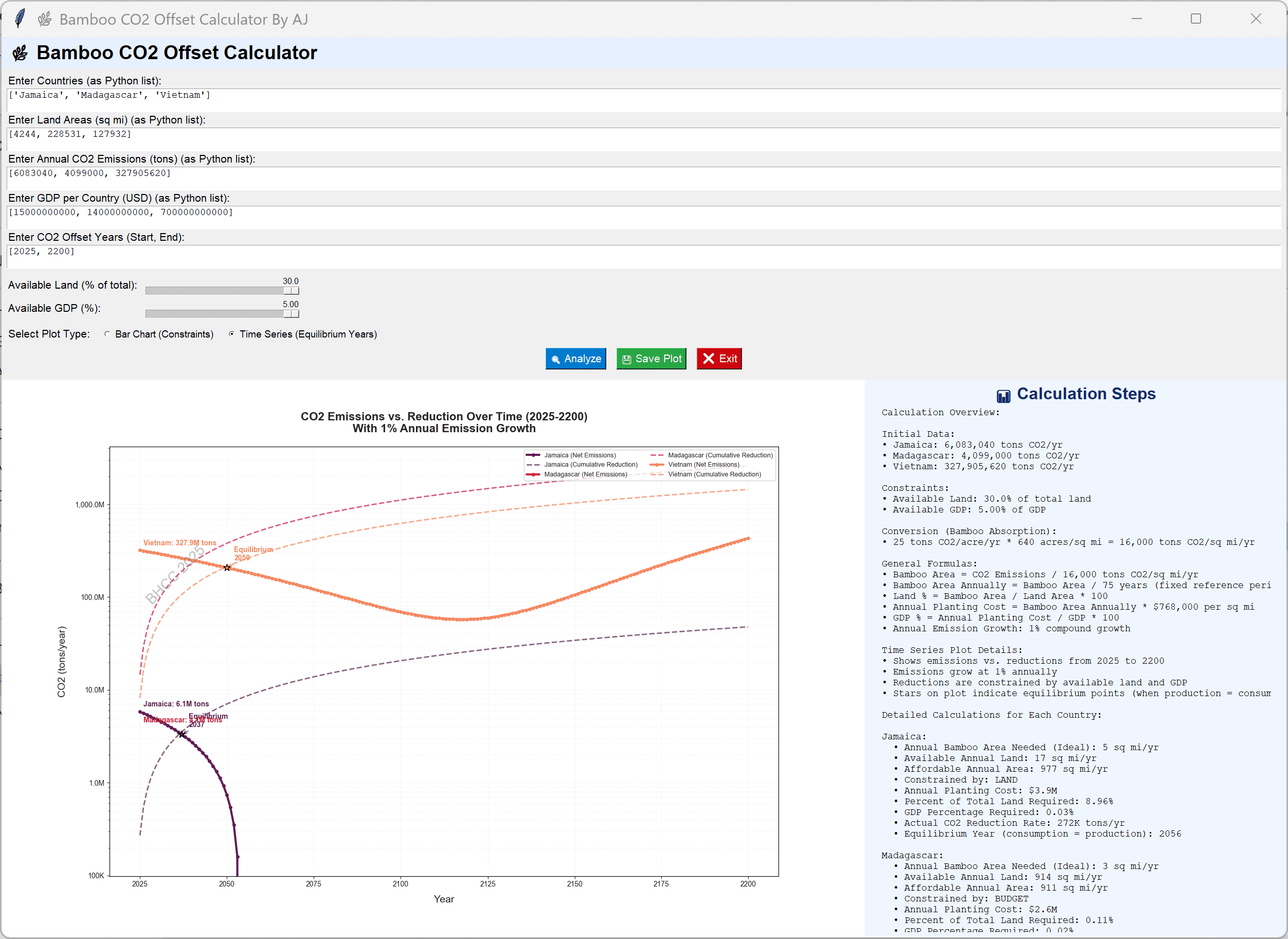 Bamboo CO₂ Offset Calculator — программа позволяет рассчитать объемов углеродных выбросов и определить площадь земель, которая необходима для их компенсации за счет посадки бамбука. Будет полезно тем, кто занимаеся экологическим анализом, оценкой воздействия на климат или планированием природоохранных мероприятий. Предлагает простотой интерфейс с достаточно широким набор параметров и настраиваемых опций.