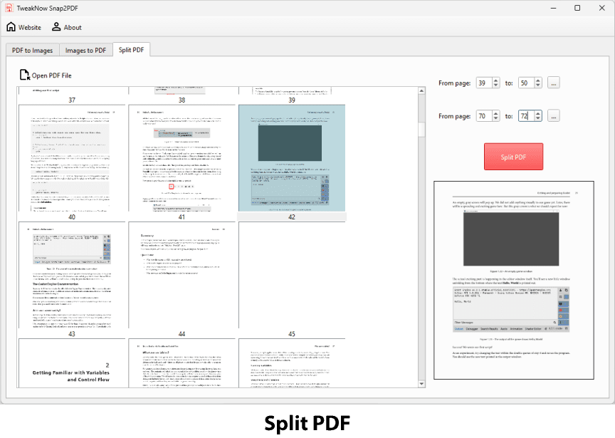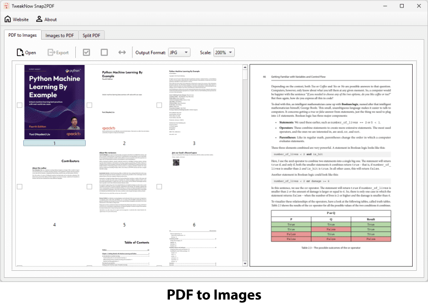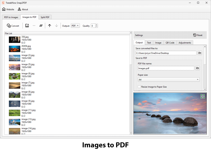 TweakNow Snap2PDF — программа для базовых операций с PDF-документами и графическими файлами. Преобразовывает изображения в PDF-формат и наоборот (PDF в графические файлы), а также разделять PDF-документы на более компактные части. Поддерживает работу с широким спектром графических форматов, включая JPG, JPEG, PNG, GIF, TIF, TIFF, HEIC, HEIF и WEBP.