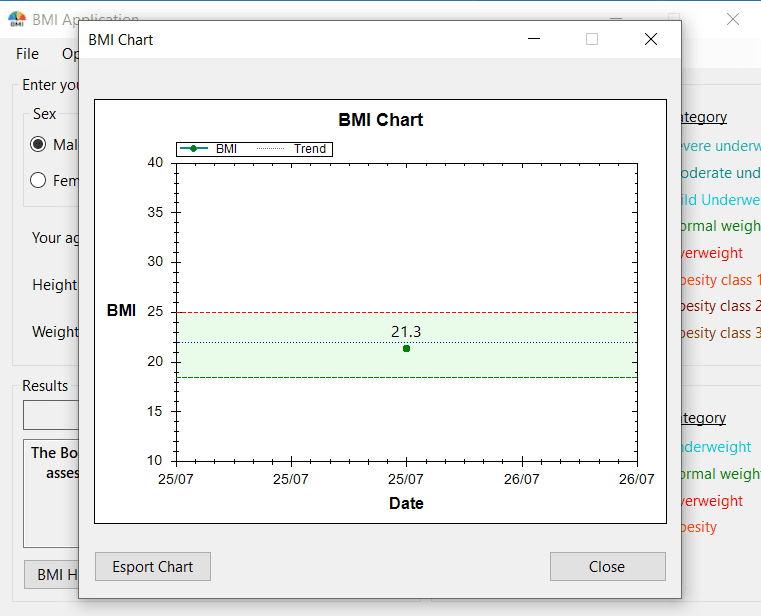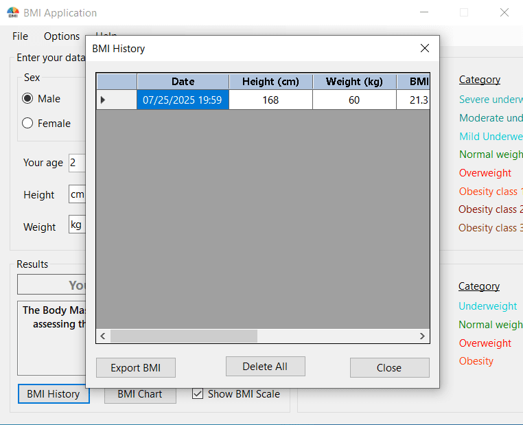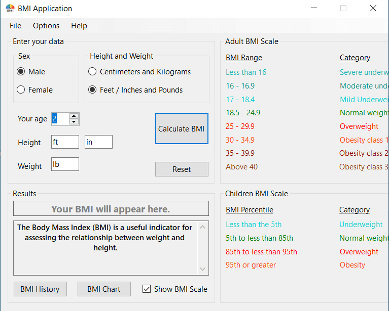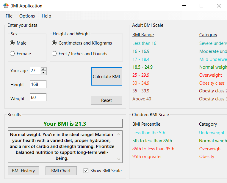 BMI Application — программа для расчета и отслеживания индекса массы тела (ИМТ), предоставляет простой инструмент, с помощью которого можно быстро определить свой ИМТ на основе основных физиологических параметров. Приложение простое в управлении и быстро осваивается без опыта работы с подобными программами. В нем доступны важные для пользователя опции: фиксация результатов, визуализация изменений и сравнение текущих значений с нормами для различных возрастов, включая взрослых и детей.