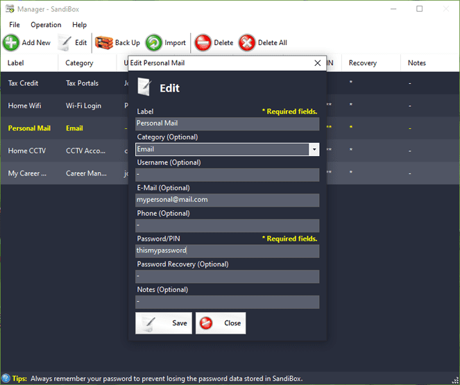 SandiBox — офлайн-менеджер паролей для безопасного хранения конфиденциальной информации без необходимости подключаться к интернету. Приложение дает возможность также сохранять реквизиты банковских карт, номера документов, контактную информацию и примечания. Все записи защищены главным паролем, который является единственным ключом доступа к хранилищу, поэтому его сохранность имеет первостепенное значение.