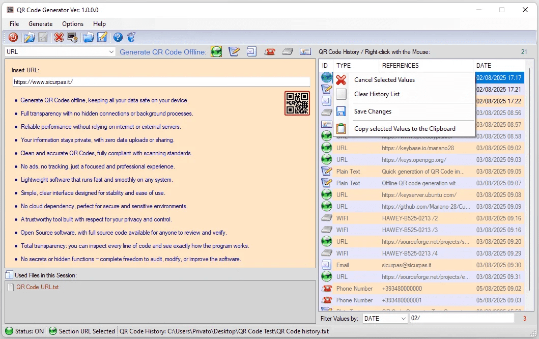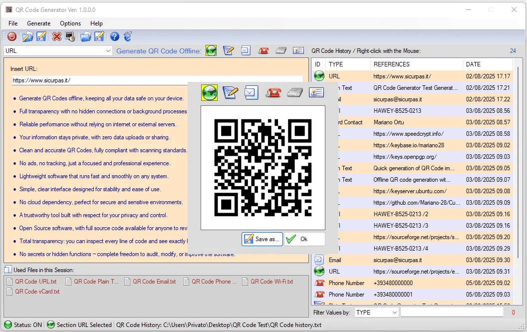 Генератор работает с различными источникамии данных: обычный текст, веб-адреса, e-mail, телефонные номера, данные для подключения к Wi-Fi и контактные визитки vCard. Работает без подключения к интернету, что обеспечивает автономную и безопасную генерацию, так как все данные обрабатываются локально.