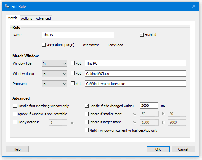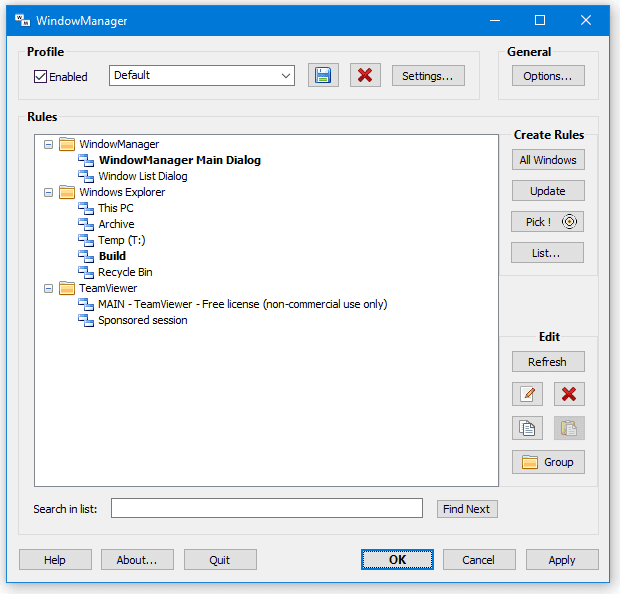 - Может фильтровать окона по заголовку, классу, исполняемому файлу и другим критериям.