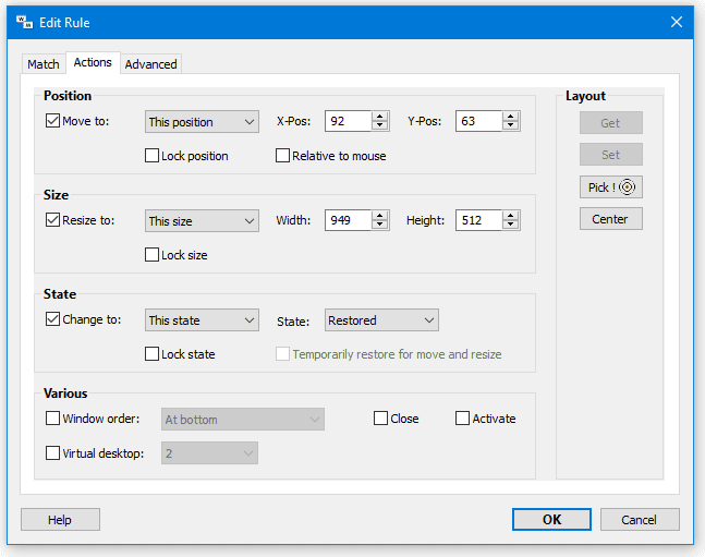 Пользователи могут управлять списком активных окон, включая вспомогательные и диалоговые окна. А также задать правила восстановления с использованием различных фильтров: по заголовку, классу, исполняемому файлу, размерам и другим параметрам. Программа также запоминает последние координаты и размеры окон, восстановление выполняться автоматически или по горячей клавише.