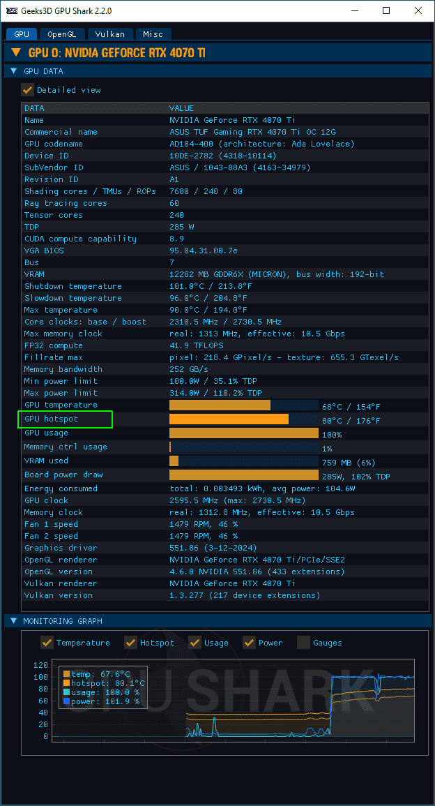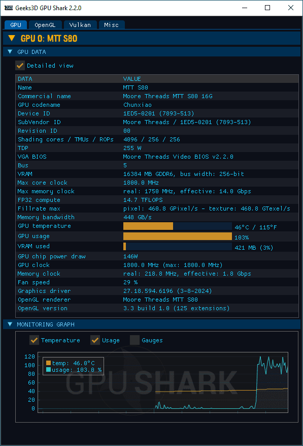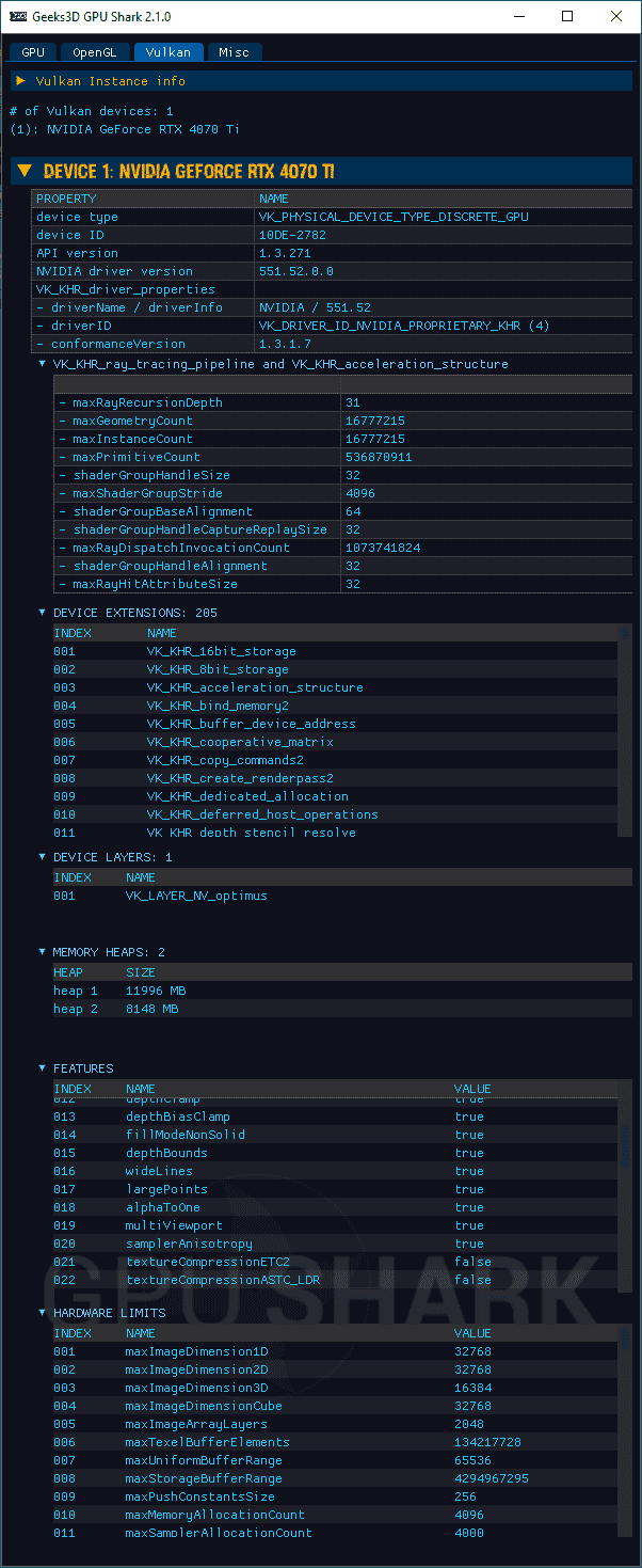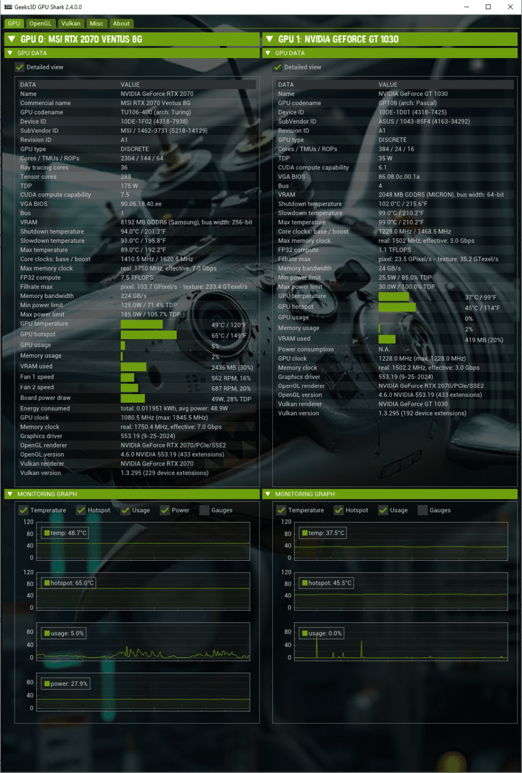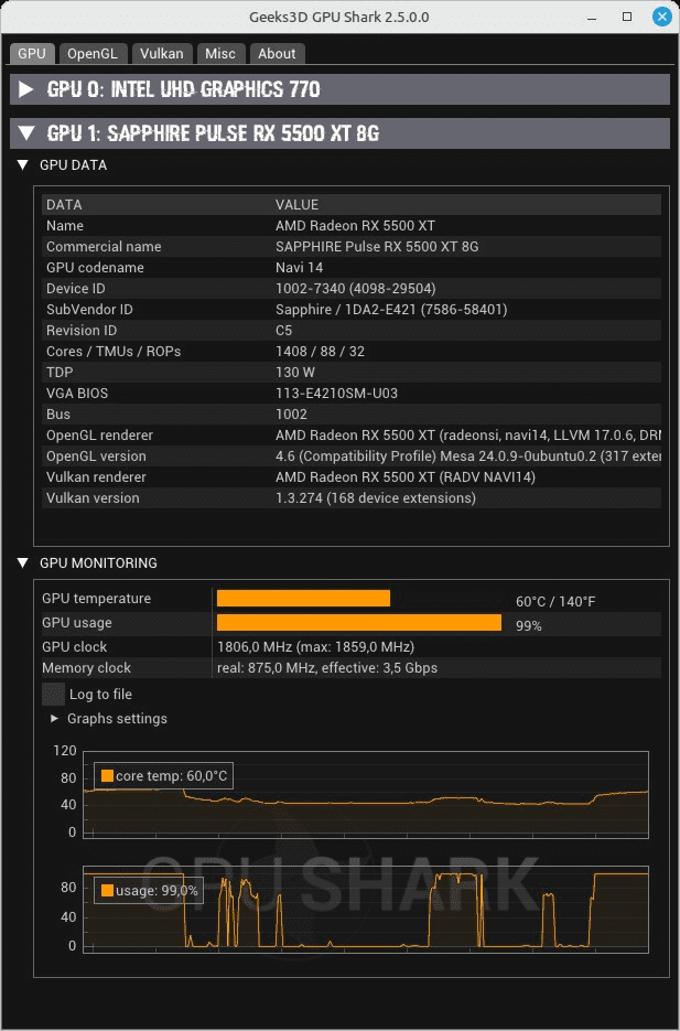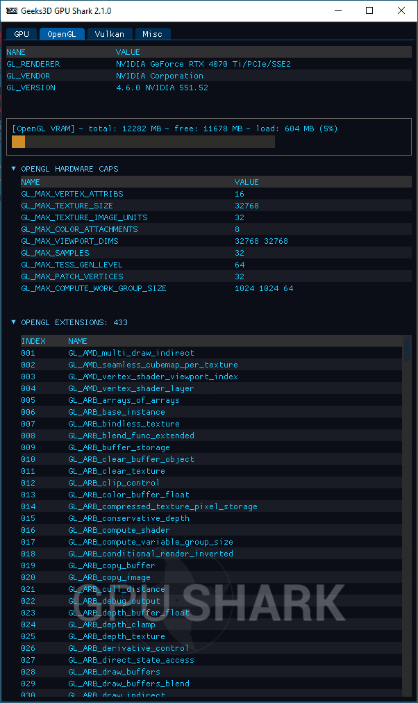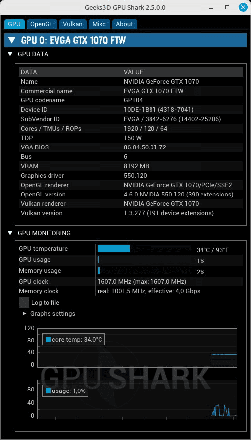 GPU Shark 2 – утилита для мониторинга состояния и анализа характеристик видеокарт, разаботанная на платформе GeeXLab, предоставляет пользователю подробную информацию о графическом процессоре и его параметрах работы в реальном времени. С помощью GPU Shark 2 можно отслеживать температуру, нагрузку, частоты работы GPU и памяти, а также уровень энергопотребления. Программа отображает полные сведения о видеокарте: производитель, модель, тип и объем памяти, версия драйвера и дополнительные характеристики.