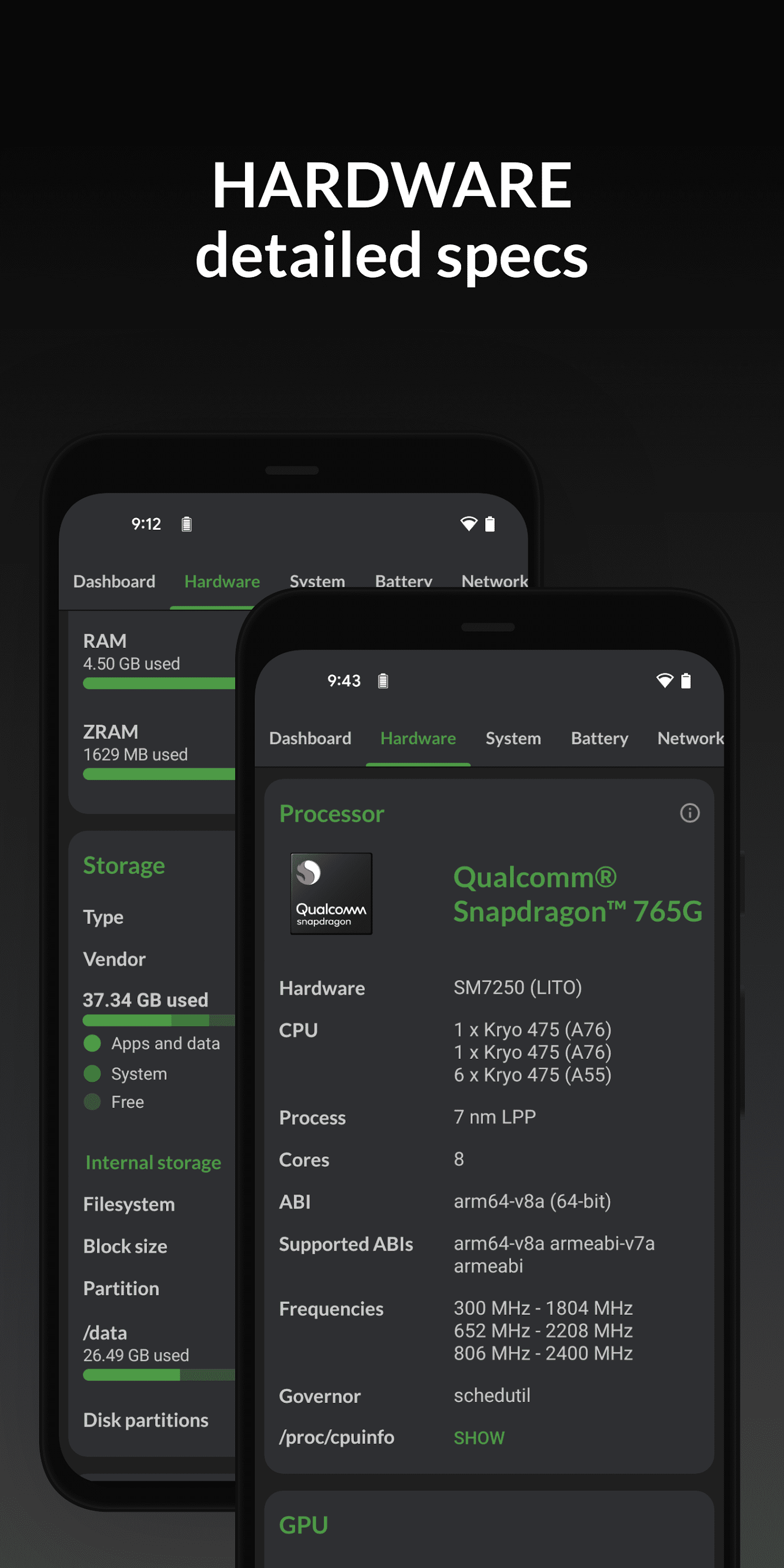Программа предоставляет сведения о системе на кристалле (SoC), в том числе архитектуру, частоты, количество ядер и используемые технологии, данные о графическом процессоре, памяти, модулях связи и поддержке Bluetooth. Также пользователи могут просматривать информацию о сетевых подключениях: Wi-Fi, мобильной связи, IP-адресах и параметрах двух SIM-карт. Для пользователей с root-правами доступны расширенные возможности анализа и контроля. Кроме того, пользователи могут мониторить состояние аккумулятора: уровень заряда, температура, напряжение, технология и емкость. Просматривать информацию о характеристиках камеры: разрешение, фокусное расстояние, поддерживаемые режимы съемки и форматы изображений.