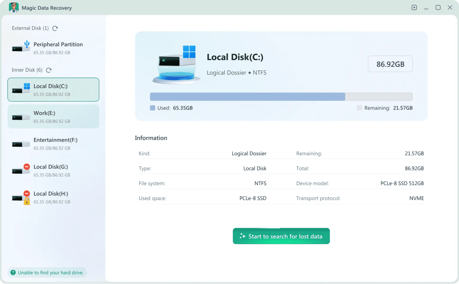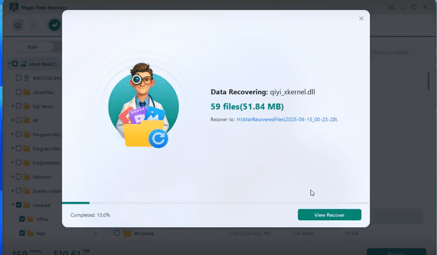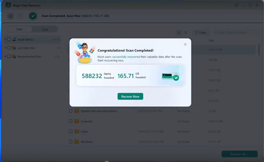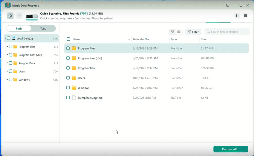 Magic Data Recovery — программа для восстановления данных, предназначенная для поиска и возврата удалённых или повреждённых файлов на компьютерах. Дает возможность вернуть документы, изображения и другим элементы, которые могли быть потеряны в результате системных сбоев, неудачных обновлений, аппаратных неисправностей или ошибок пользователя. Для упрощения поиска нужных элементов предусмотрены фильтры по типу файлов, размеру и дате изменения.