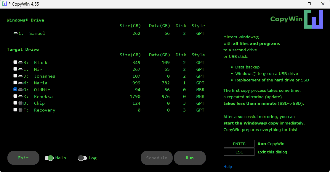 CopyWin — инструмент для зеркалирования системного диска Windows и резервного копирования данных на внешний носитель. Позволяет быстро и удобно создать точную копию диска на другом жестком диске, USB-накопителе или карте MicroSD. Будет полезно, когда нужно заменить оборудование, провести миграциюи системы или создать переносную версию Windows.