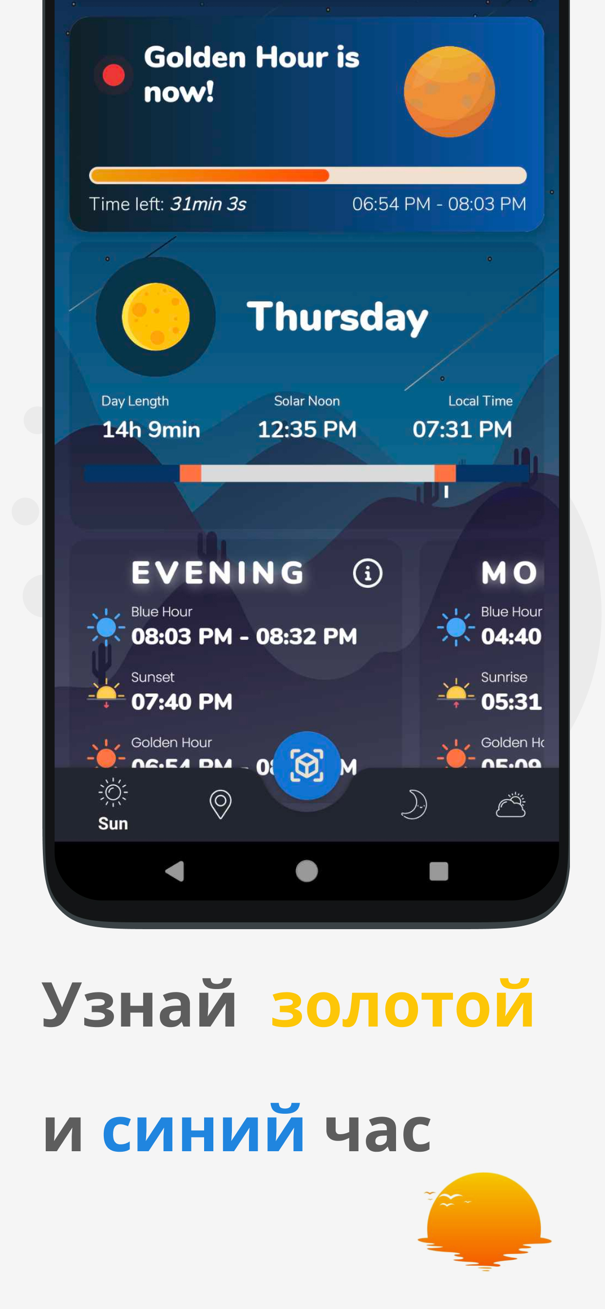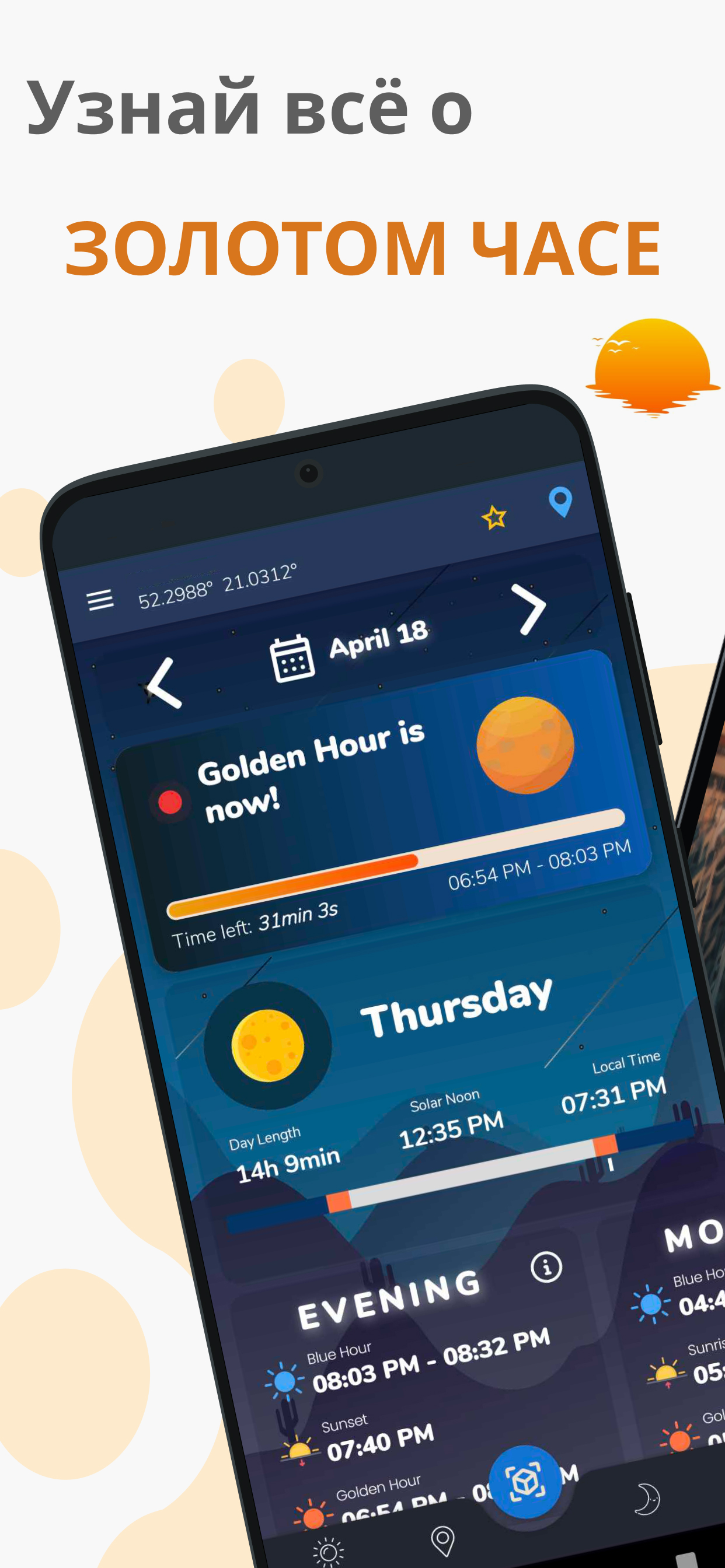 - Помогает определить временя золотого и синего часа для любых дат и локаций.