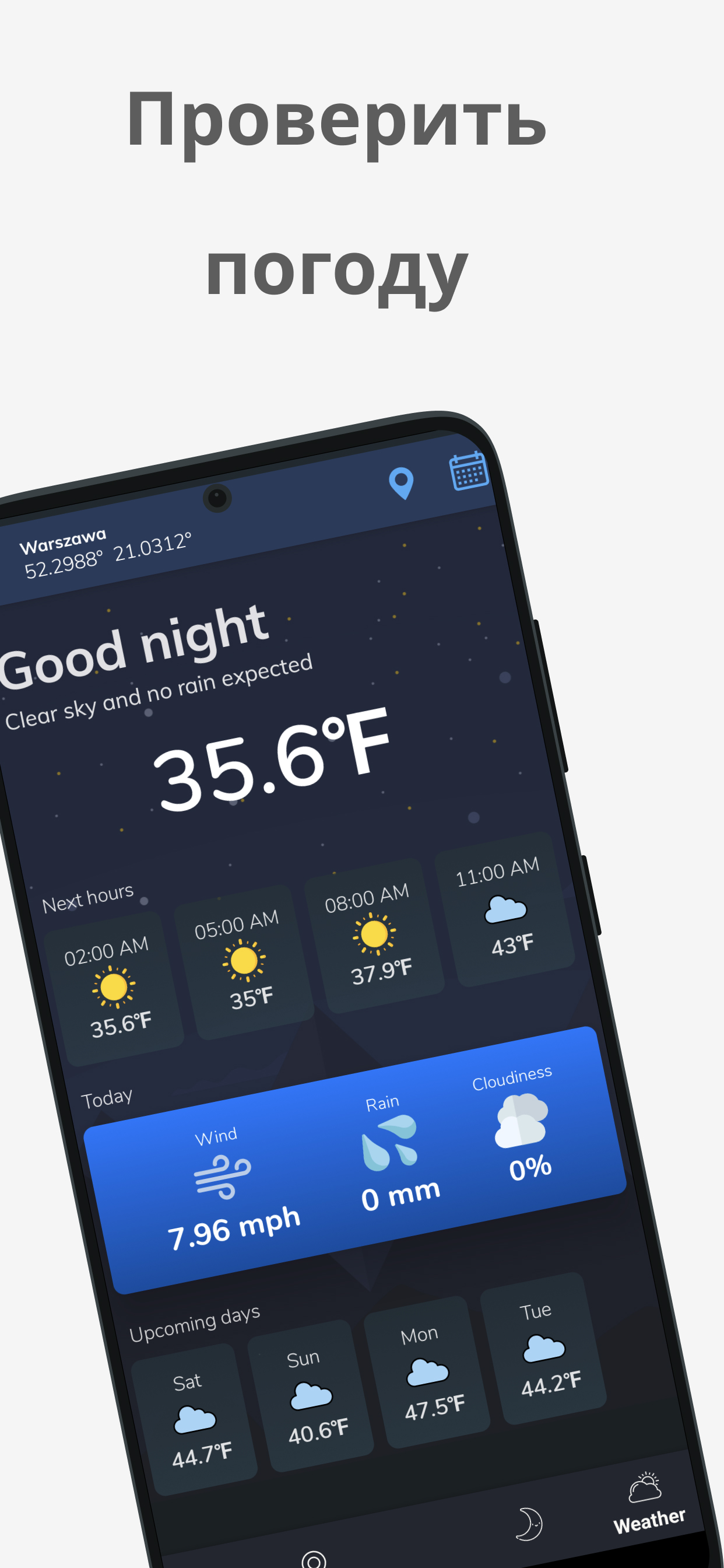 - Отображает точное времени восхода и заката Солнца и информацию о фазах Луны.