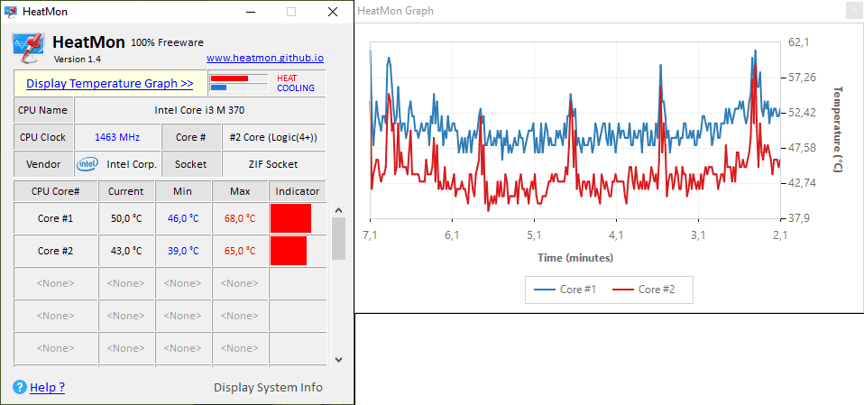 HeatMon — утилита для мониторинга состояния процессора, контролирует температуру и напряжения по каждому ядру. Программа разработана с учётом особенностей современных систем, где перегрев может негативно повлиять на производительность и стабильность работы. Позволяет отслеживать ключевые параметры в реальном времени и сохранять данные для дальнейшего анализа, что делает его полезным инструментом для пользователей ноутбуков и настольных ПК.