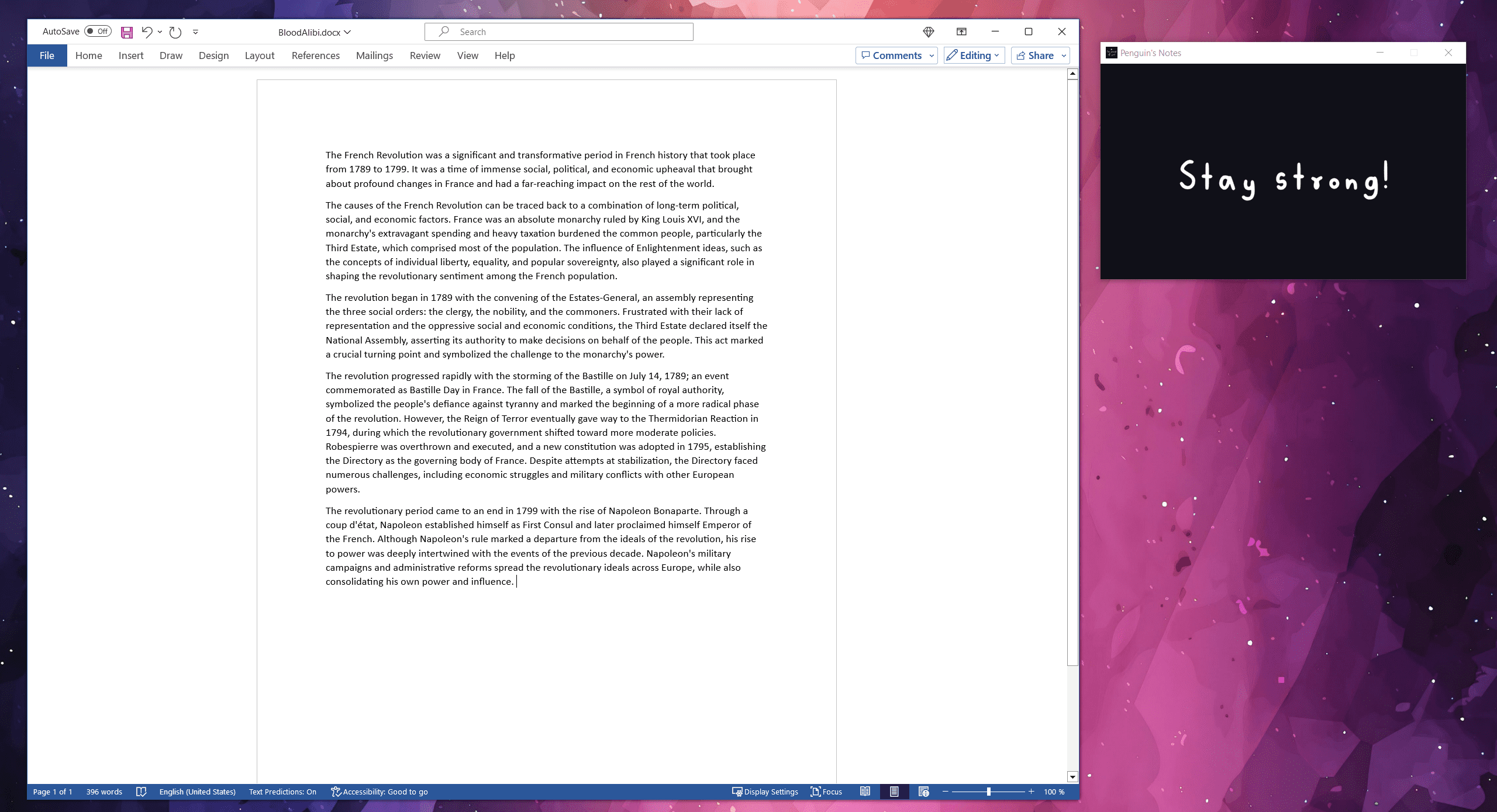Penguin's Notes — компактное приложение, которое отображает мотивирующие сообщения, чтобы пользователи могли сохранять настрой, уверенность и концентрацию на задачах. Не содержит дополнительных функций и сосредоточено исключительно на том, чтобы предоставлять слова поддержки и ободрения.