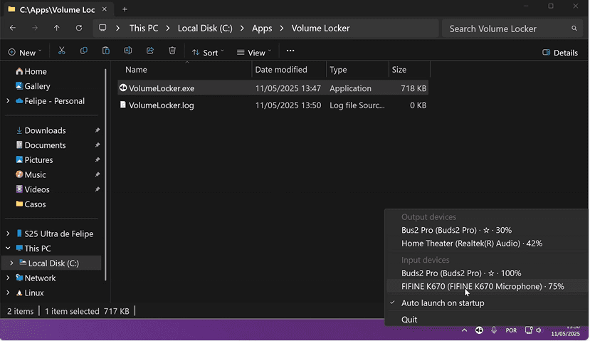 Volume Locker — утилита для фиксации уровня громкости на выбранных аудиоустройствах и предотвращения его непреднамеренного изменения. Программа отслеживает заданные параметры и автоматически возвращает громкость к установленному значению, если система или другое приложение пытается ее изменить. Что помогает избежать ситуаций, когда звук неожиданно становится слишком тихим или громким, особенно при видеозвонках, онлайн-конференциях или работе со звуком.