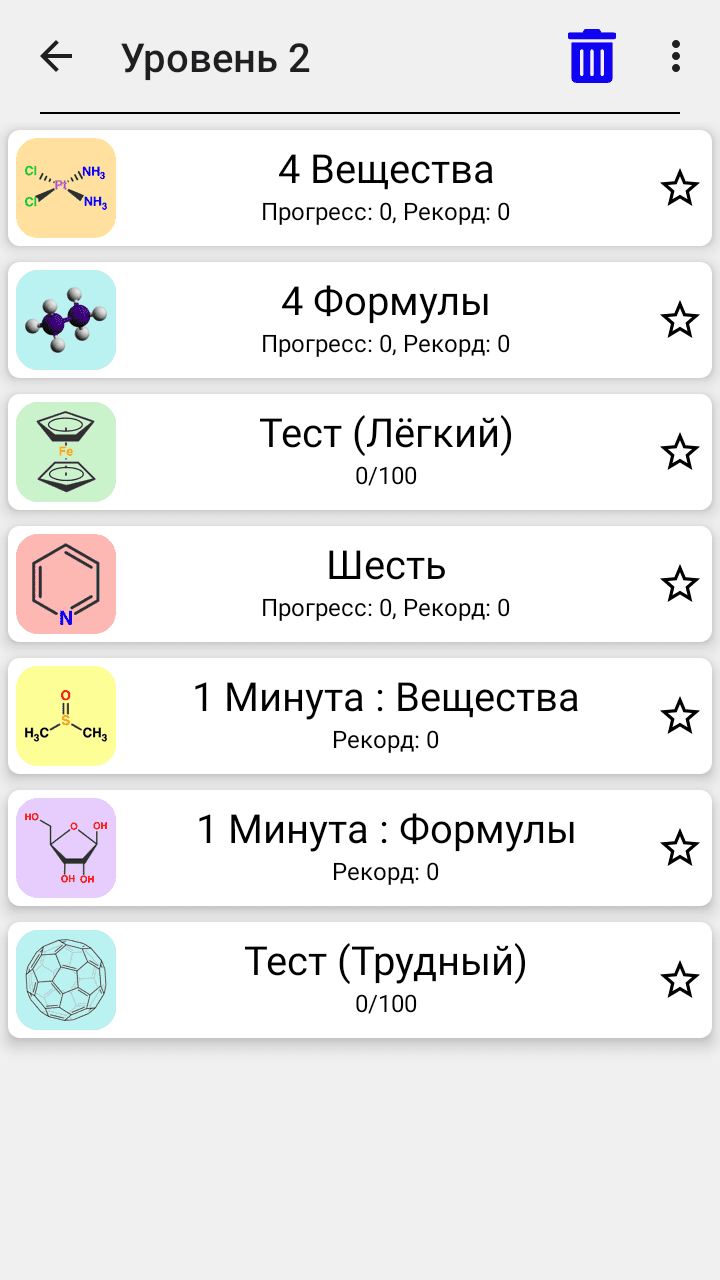 Chemical Substances: Chem-Quiz — образовательное приложение для изучения химических соединений, элементов и их структур. Будет полезно школьникам и студентам при подготовке к экзаменам или олимпиадам по химии. Программа содержит более 300 химических веществ и элементов, сгруппированных по уровням сложности и разделам химии, что делает процесс обучения структурированным и удобным. Для закрепления знаний используются разные игровые режимы: угадывание формул и названий по буквам, тесты с вариантами ответа, тренировка на время, флэш-карточки и таблицы соединений.