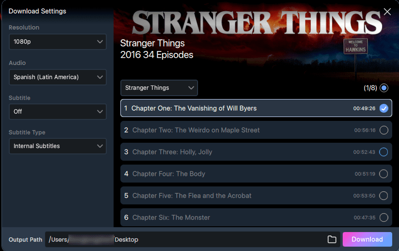 - Возможность выбора аудиодорожки и встроенных субтитров при скачивании.