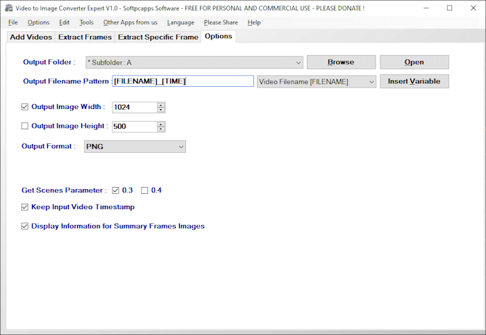 Программа предоставляет широкий набор параметров для настройки процесса извлечения. Присутсвует возможность задать частоту извлечения кадров и другие критерии, влияющие на качество и количество создаваемых изображений. Также доступна возможность ручного выбора кадра через встроенное воспроизведение видео.