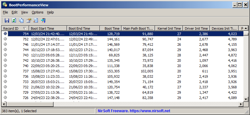 BootPerformanceView – портативная утилита для ОС Windows, предназначенная для анализа и отображения сведений о производительности процесса загрузки компьютера. Программа работает с системными журналами событий и позволяет детально изучать этапы старта системы, включая временные показатели каждого из них.