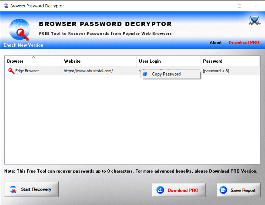 Browser Password Decryptor — приложение, предназначенное для восстановления забытых или утерянных паролей, сохраненных в популярных веб-браузерах. Приложение автоматически извлекает данные для авторизации и отображает их в удобном интерфейсе.