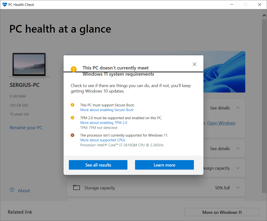 - Отображение подробного отчета о совместимости и возможности обновления до Windows 11.