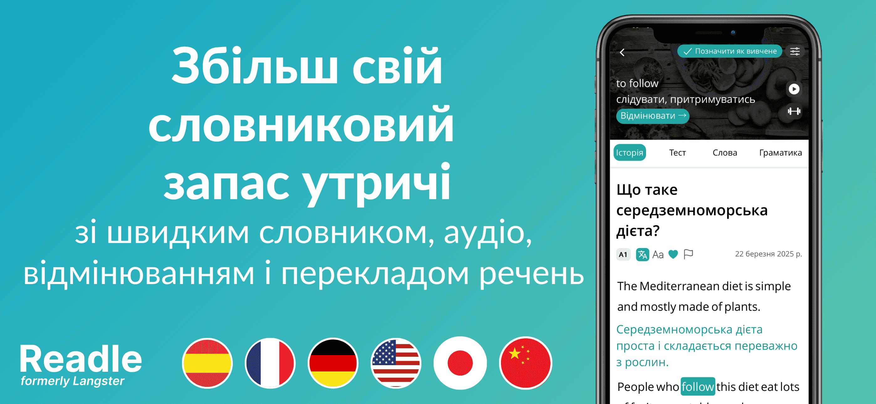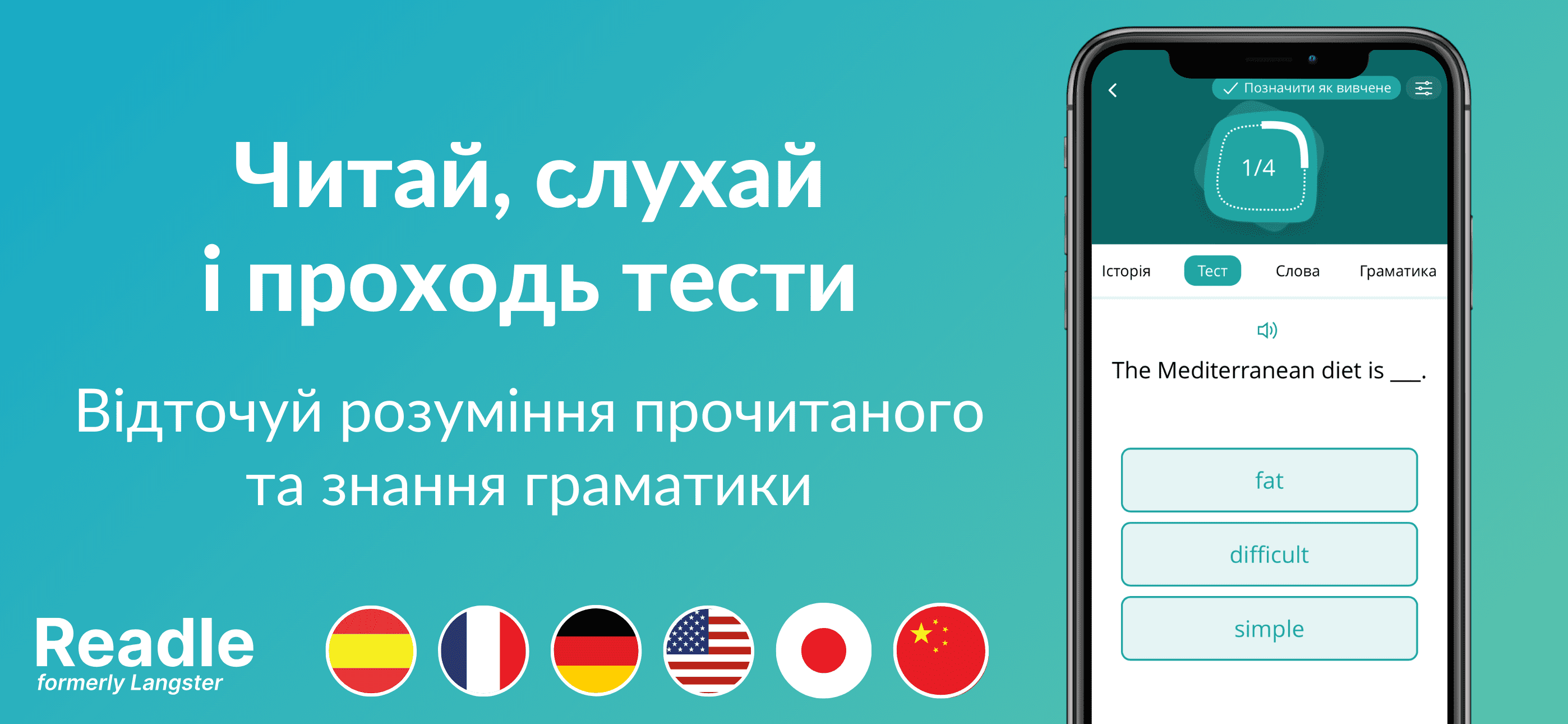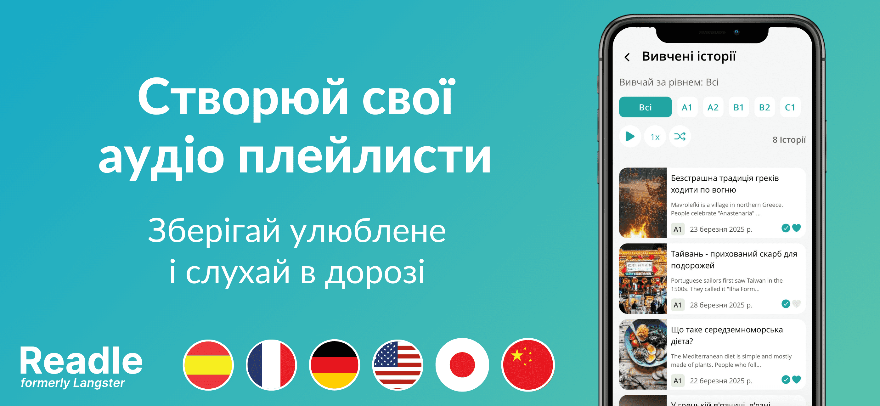 Readle — приложение для изучения иностранных языков с помощью реальных новостей и историй. Программа предназначена для пользователей уровней A1–B2 по шкале CEFR и предлагает контент, адаптированный под: английский, французский, немецкий, испанский, японский и китайский. Содержит инструменты, которые развивают чтение, аудирование и комплексное развитие языковых навыков. Подходит как для самостоятельного изучения языка и практики в рамках подготовки к международным экзаменам.