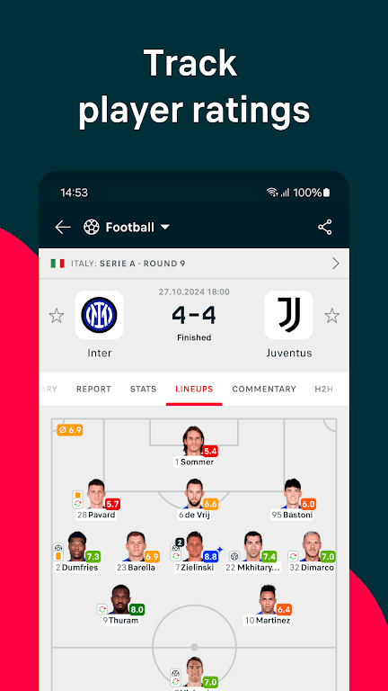 Сервис помогает отслеживать счета, карточки, замены, ожидаемые голы (xG), оценки игроков, коэффициенты и другие аналитические показатели, уведомляет о событиях матча и позволяет настраивать персонализированные оповещения для избранных команд, турниров и спортсменов. Кроме того приложение объединяет мультимедийный контент, текстовые трансляции и полную статистику, что делает его комплексным решением для фанатов спортивных соревнований.