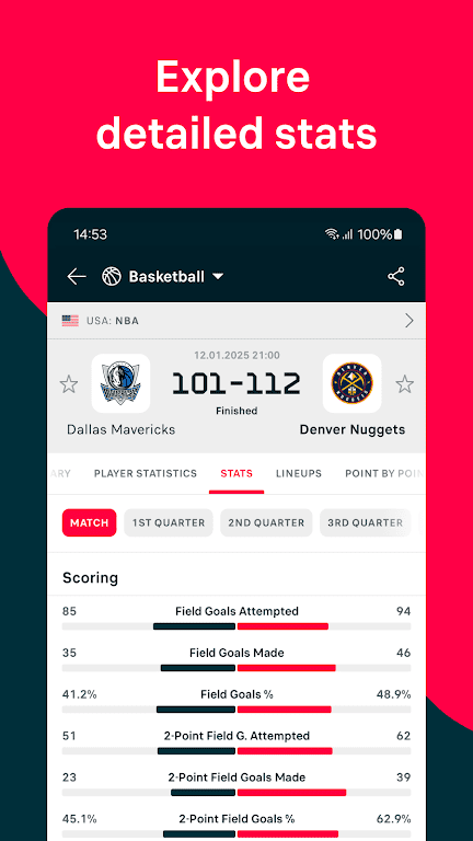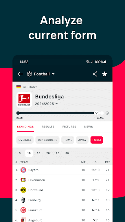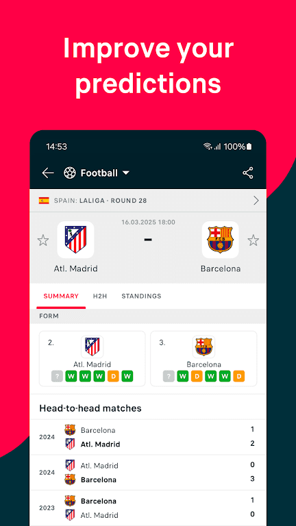 Flashscore: Live Scores & News — приложение для отслеживания спортивных результатов в режиме реального времени в 30 видах спорта и 6000 турнирах по всему миру, в том числе футбол, теннис, баскетбол, хоккей, волейбол и другие дисциплины. Программа отображает полную информацию о ходе матчей, статистику, составы команд, индивидуальные показатели игроков и таблицы соревнований.