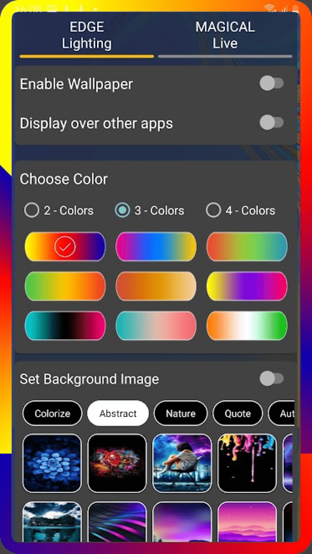 Пользователи могут самостоятельно настроить параметры подсветки: выбирать цветовую палитру, толщину рамки, форму углов и скорость анимации. Предусмотрена возможность установить живые обои с эффектом EDGE Lighting или добавить собственное изображение в качестве фона. Приложение адаптировано для устройств различных брендов: Samsung, Xiaomi, OnePlus, Nokia, Oppo и других.