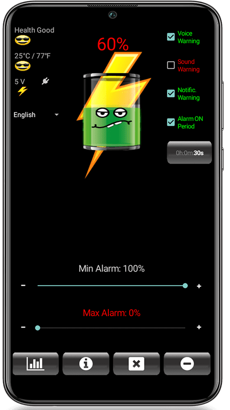 Battery Alarm — простое и удобное приложение, которое помогает контролировать уровень заряда аккумулятора смартфона. Программа уведомляет пользователя о критически низком или полном заряде батареи и помогает избежать розрядки или избыточной зарядки. Для уведомлений предусмотрено три режима: голосовое сообщение, звуковое оповещение и системное уведомление. Пользователи самостоятельно выбирают тип сигнала и уровень громкости каждогоиз них.