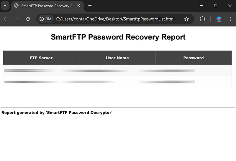 SmartFTP Password Decryptor — утилита для восстановления сохранённых паролей FTP-клиента SmartFTP, дает возможность быстро восстановить доступ к сохранённым учётным данным без необходимости ручного поиска. Сканирует локальные профили SmartFTP, извлекает логины, пароли и соответствующие адреса FTP-серверов, что позволяет систематизировать и проверить найденную информацию. Все результаты можно просмотреть прямо в окне приложения, скопировать вручную или экспортировать в файлы форматов HTML, XML, TXT или CSV.