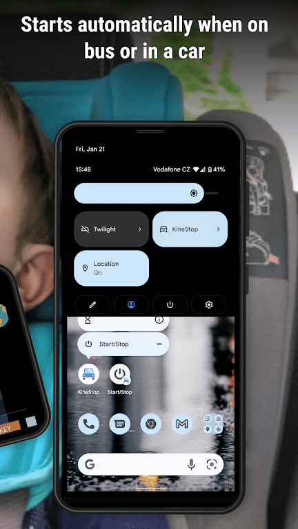KineStop — приложение для снижения симптомов укачивания (кинетоза) во время поездок на транспорте. Помогает пользователю комфортно читать, смотреть фильмы или работать с телефоном в машине, автобусе или другом транспортном средстве без головокружения, тошноты и усталости. Программа основана на визуальном принципе синхронизации сигналов, поступающих от глаз и внутреннего уха, что дает возможность устранить несоответствие восприятия движения и стабилизировать самочувствие.