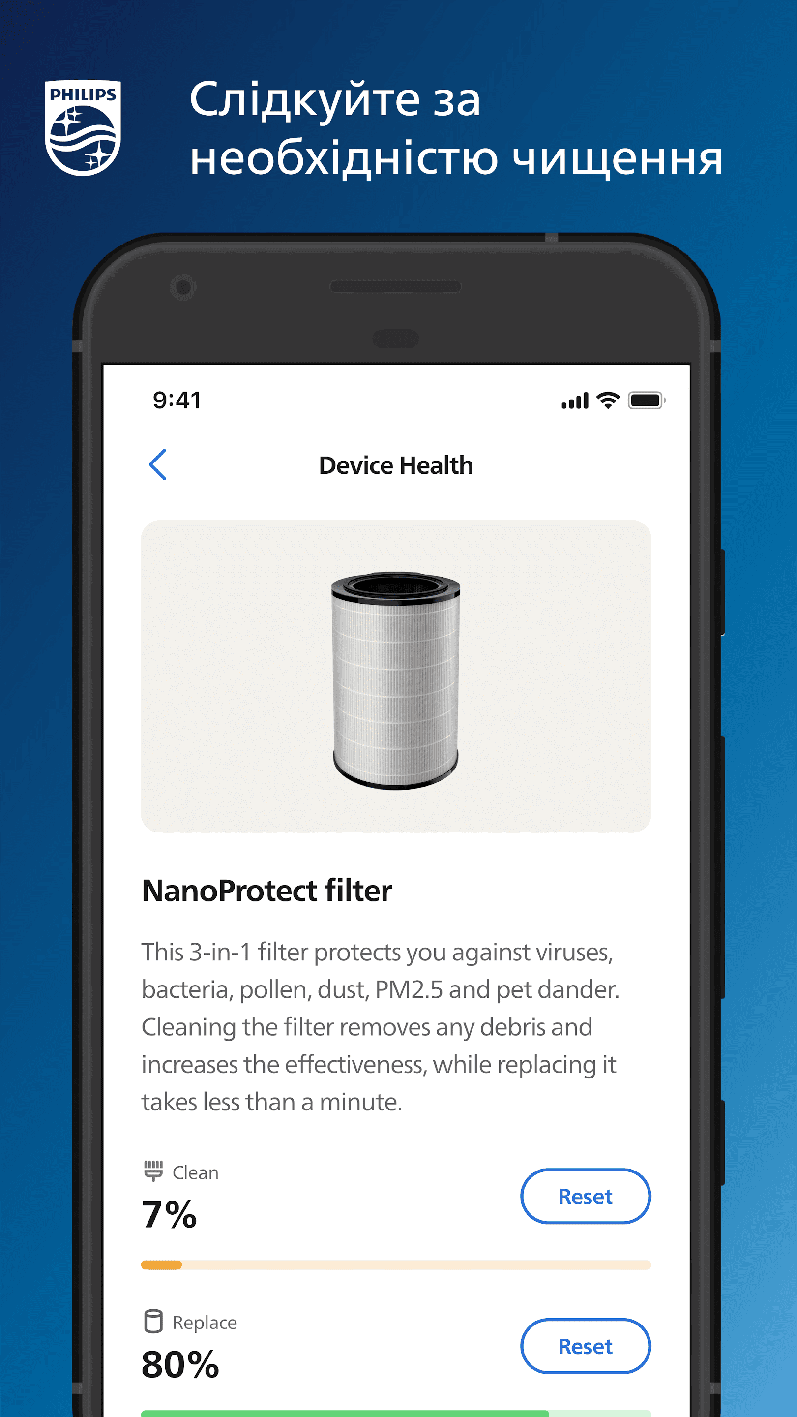 - Дает подсказки и инструкции для очистки или замены фильтров с возможностью заказа новых через приложение.