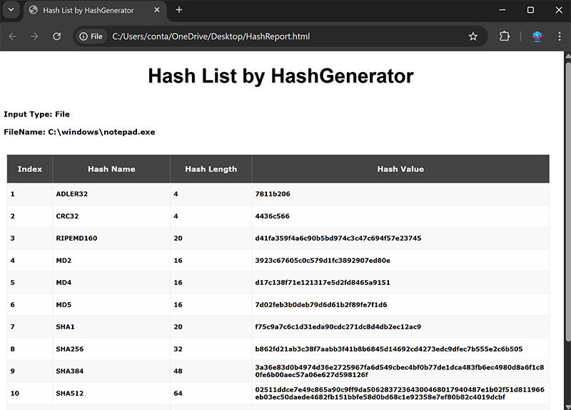 Приложение можно запускать напрямую с жесткого диска, USB-накопителя или любого внешнего устройства хранения данных. Hash Generator выводит рассчитанные хеш-значения в основной панели, среди поддерживаемых алгоритмов: ADLER-32, CRC-32, RIPEMD-160, MD-2, MD-5, SHA-1, SHA-256, SHA-512, HAVAL-256-4 и WHIRLPOOL. Помимо результата хеширования, программа также отображает длину полученной контрольной суммы. Результаты можно сохранить в формате HTML, TXT или XML, что упрощает их использование при документировании или сравнительном анализе.